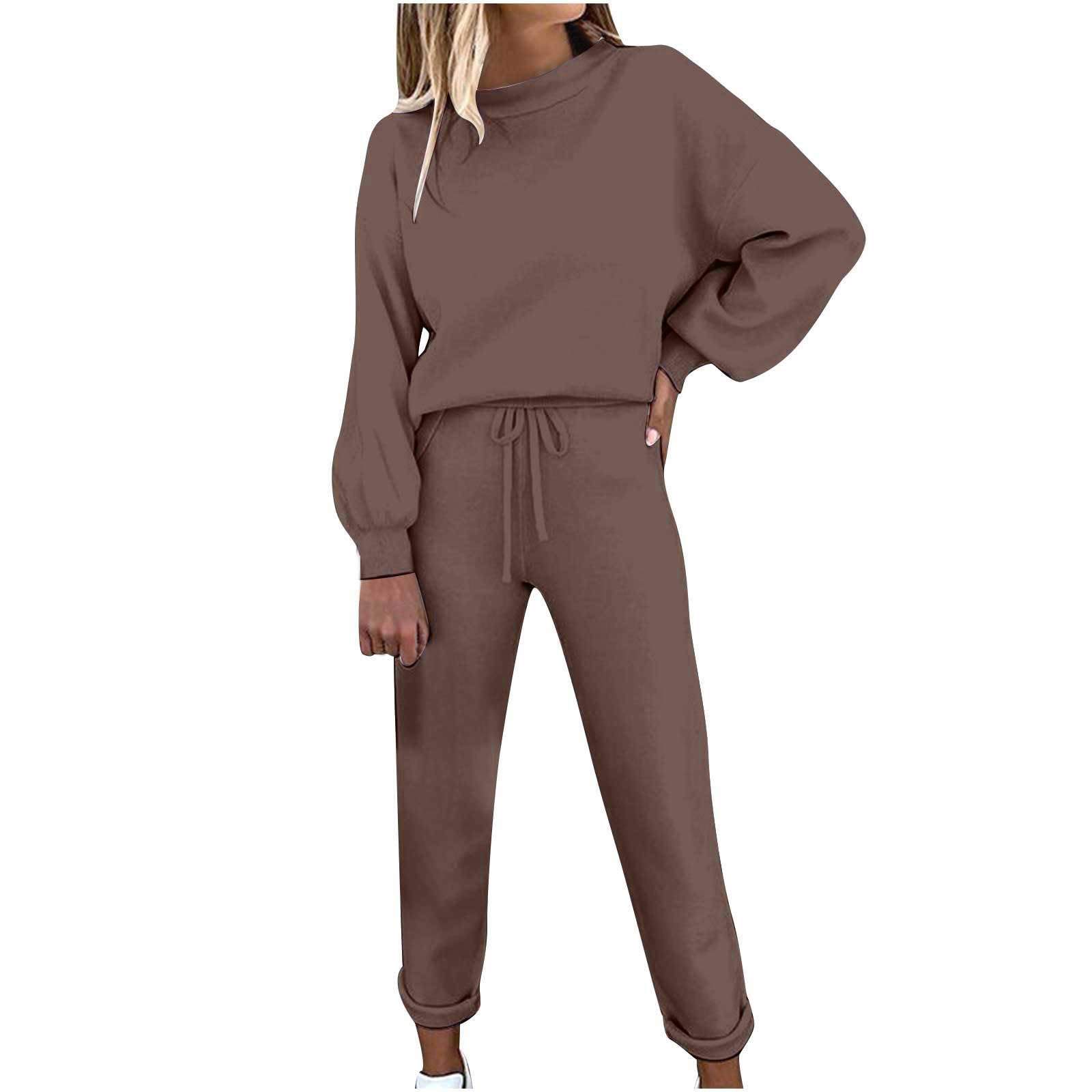 Women's 2 PC Outfits Solid Casual Crewneck Pullover Tops with Loose Drawstring Lounge Pants Trendy Sweatsuit Sets