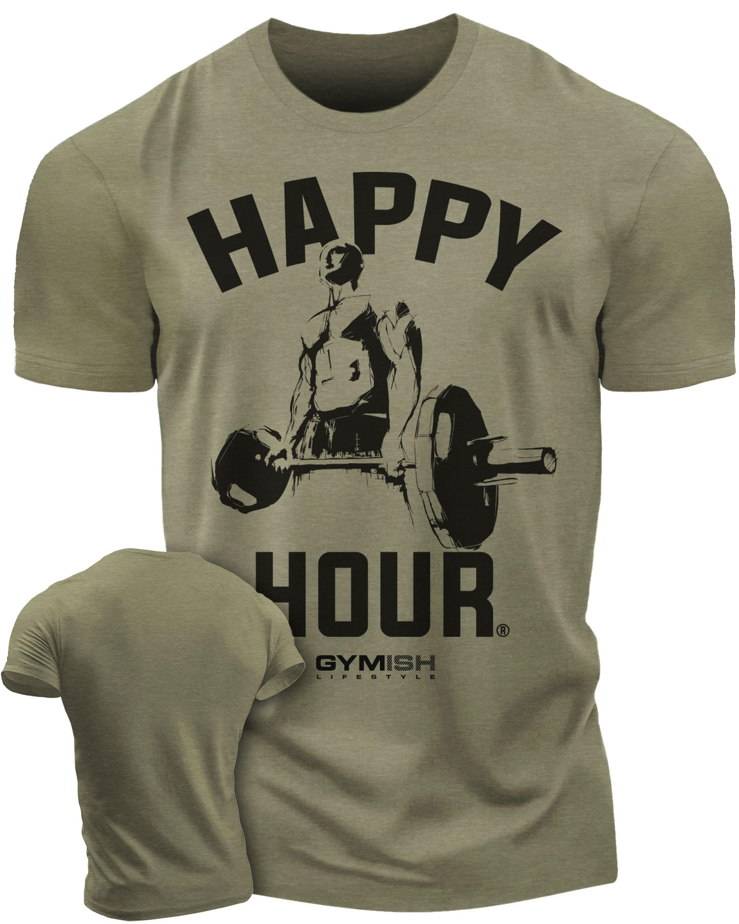 Happy Hour Deadlift Gym Shirt - Introducing Gymish Lifestyle's collection of male gym workout t-shirts, the perfect addition to your workout wardrobe. Our motivational gym t-shirts are designed to inspire and motivate you to push harder and reach your fitness goals. Whether you're hitting the gym, w