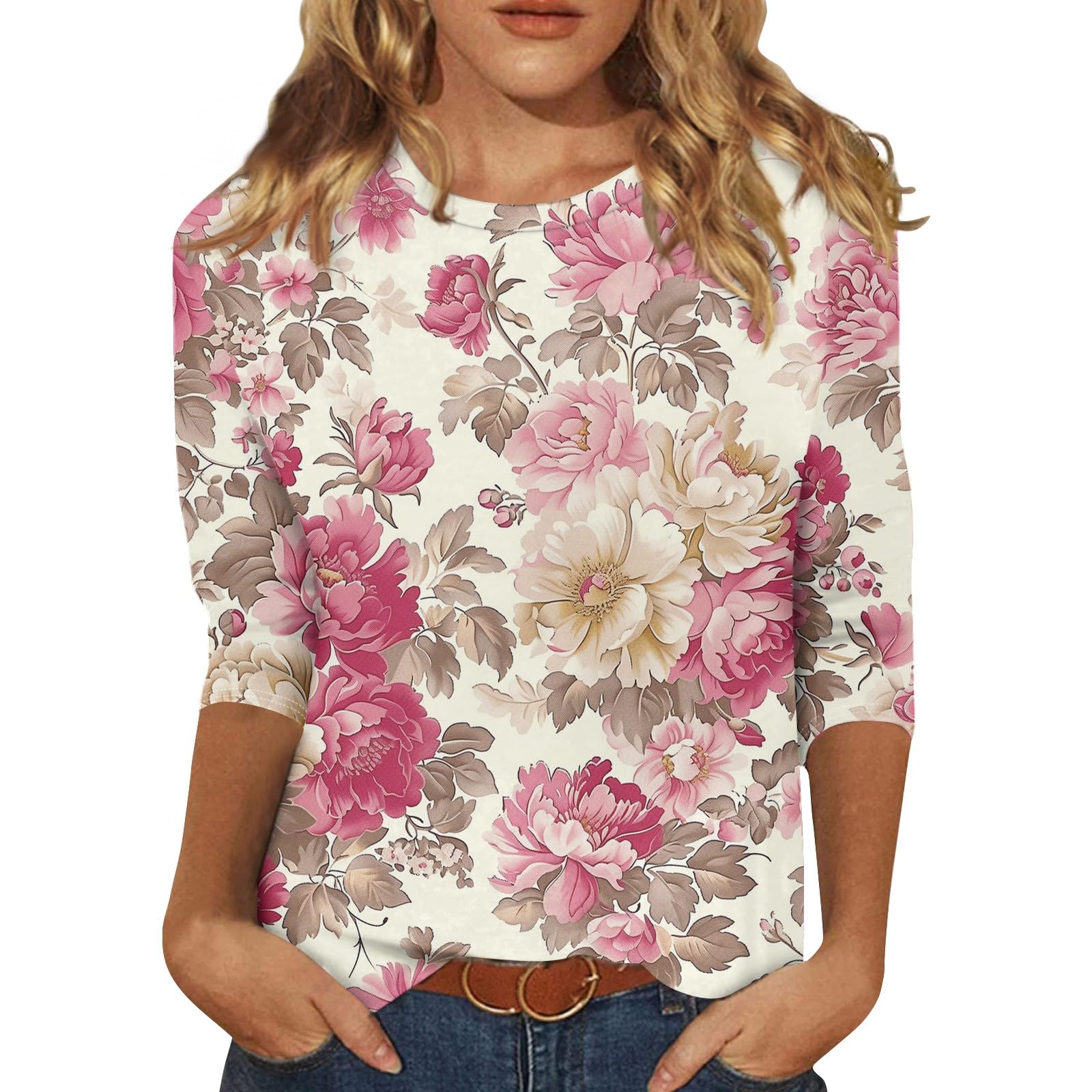 WJDNHKYD Women's 3/4 Sleeve Shirts Crew Neck Loose Tops Casual Solid Color Tshirts Basic Tunic Summer Ladies Tops