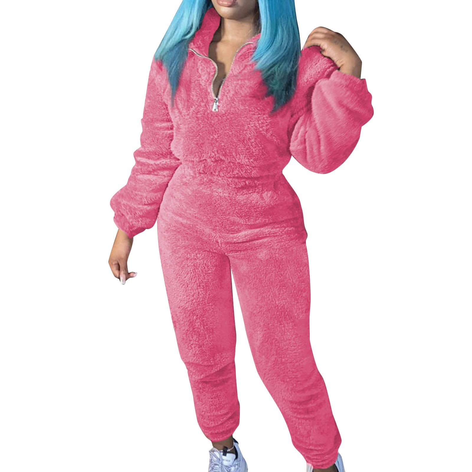 Womens Fall Lounge Sets 2 Piece Outfits Winter Pyjamas Set Furry Cropped Quarter Zip Sweatshirts Jogger Pant Set