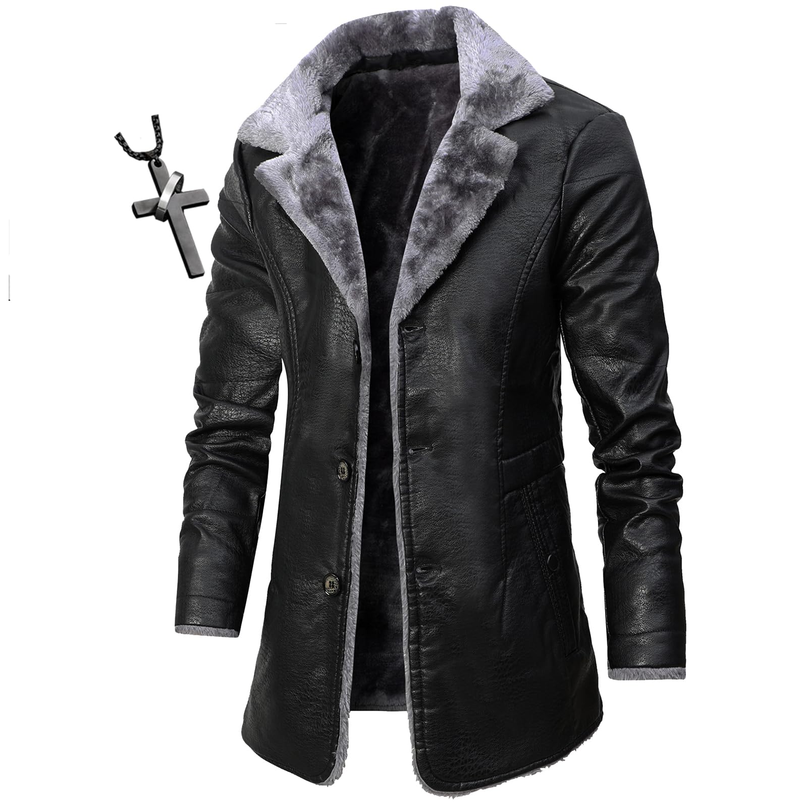 HECLOK Mens Genuine Leather Biker Jacket 3/4 Length Coat Warm Winter Long Leather Jacket Lined Trench Coat+(Necklaces)