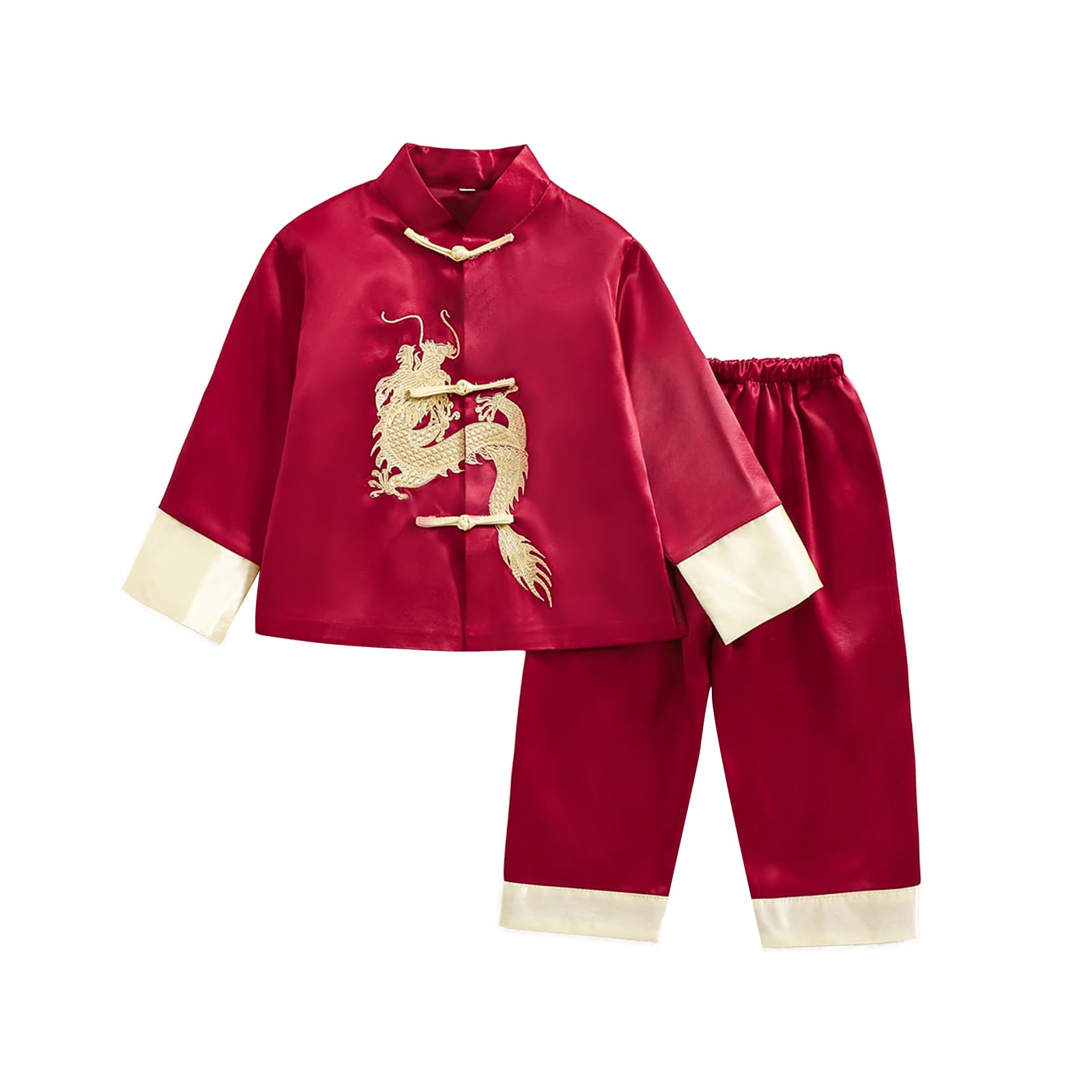 [High Quality]:Boys chinese new year outfit is made of satin. [Design]:Kids chinese new year clothes,with the stand-up collar,Chinese traditional dragon pattern, toggle loop button design,classic Chinese red matching color. [Occasion]:Chinese new year clothing,Great for Spring Festival, photography