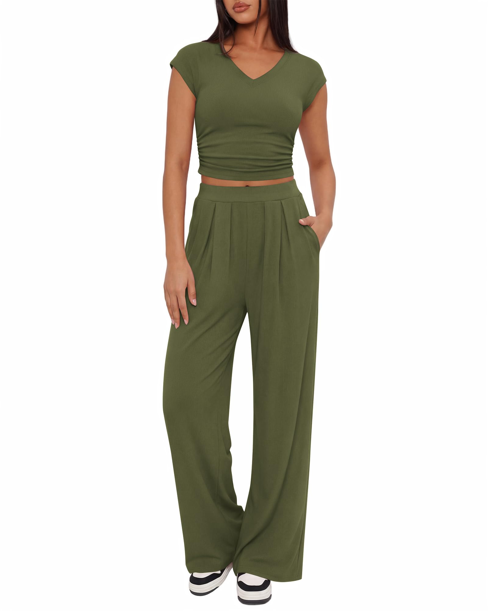 BTFBM Womens 2 Piece Outfits Spring 2026 V Neck Cap Sleeve Ruched Top Wide Leg Pants Sets Rib Knit Lounge Matching Set