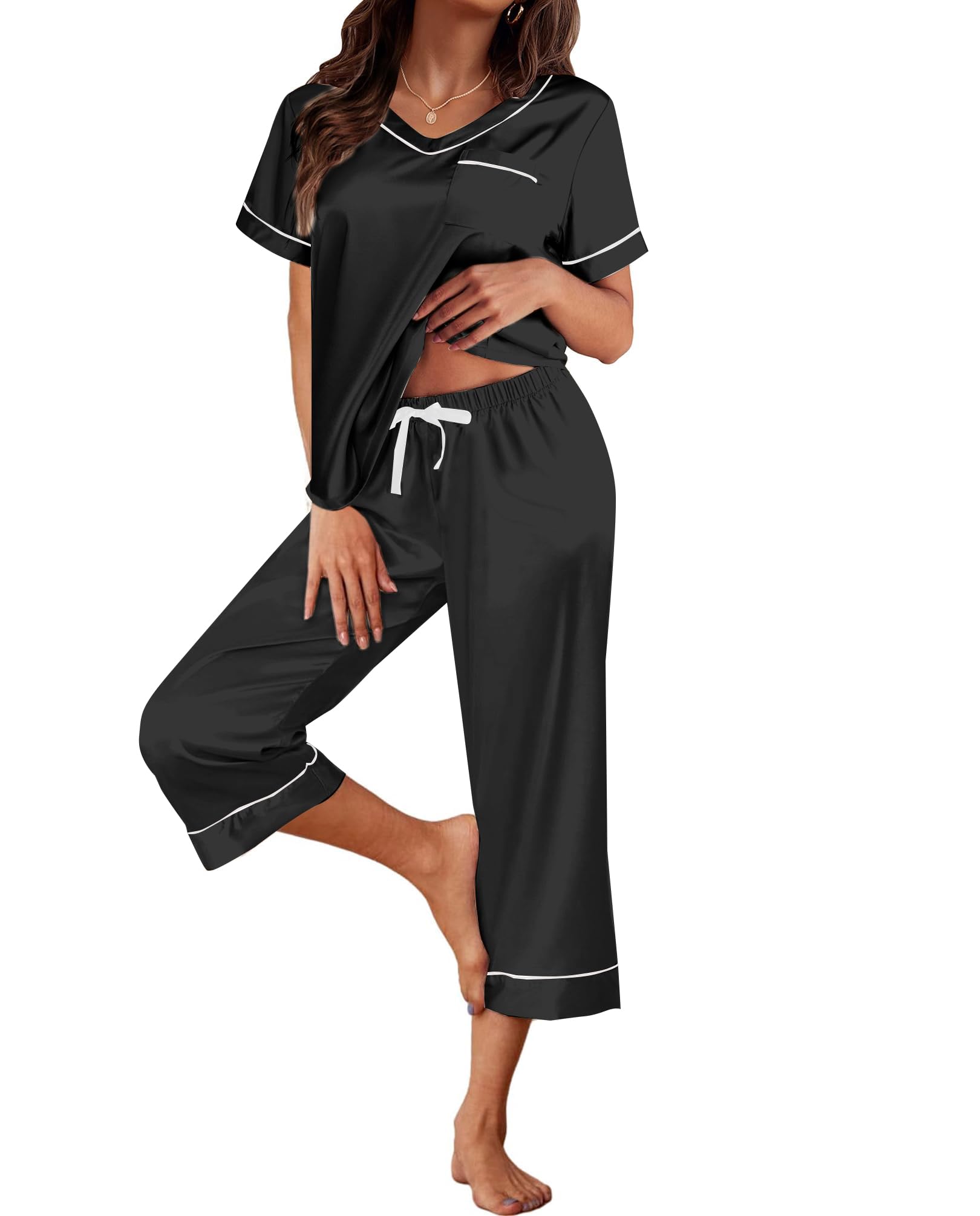 Title: Remidoo Women's Short Sleeve V Neck Shirt With Capri Pants Satin Silk Pajama Set 2 Piece Pj Black Medium. Product Type: Clothing, Shoes & Jewelry > Departments > Women > Clothing > Lingerie, Sleep & Lounge > Sleep & Lounge > Sets