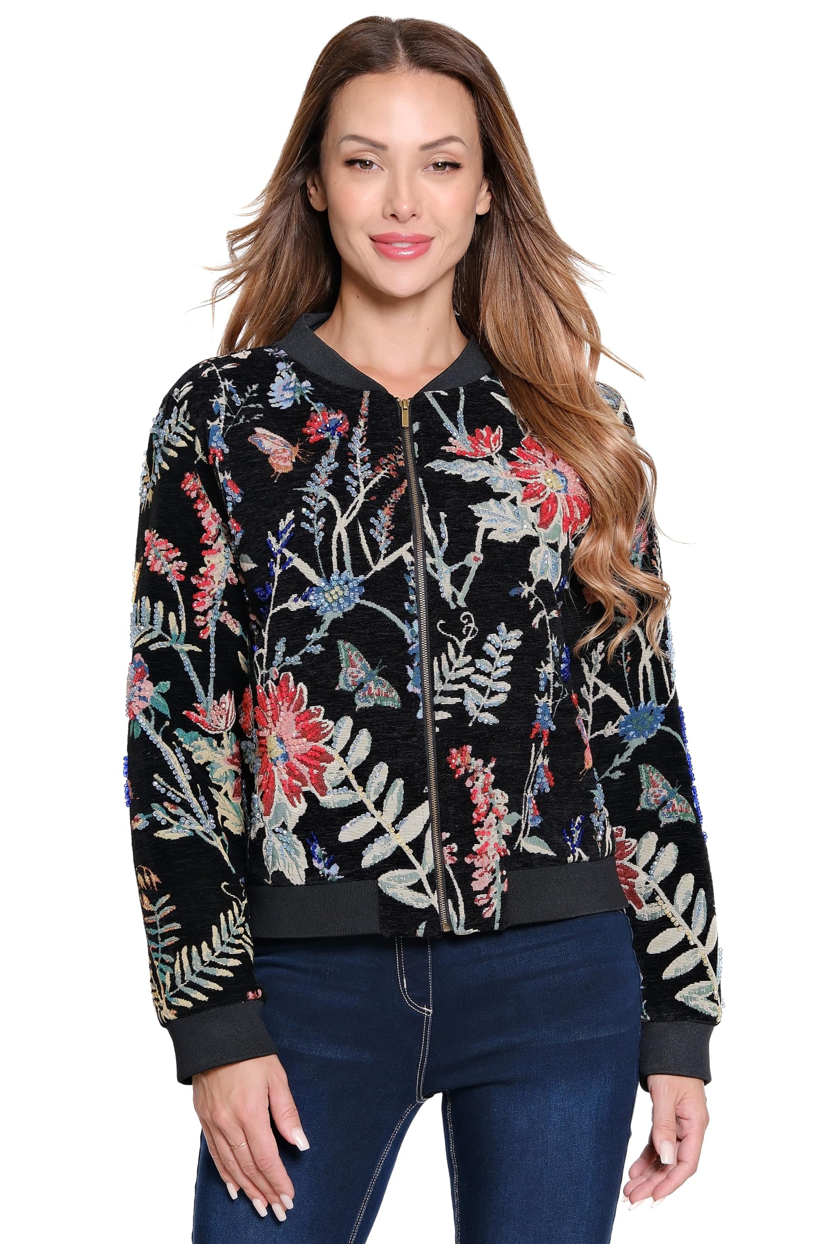 John-Mark womens Tapestry Zip Front Jacket With Beaded Details