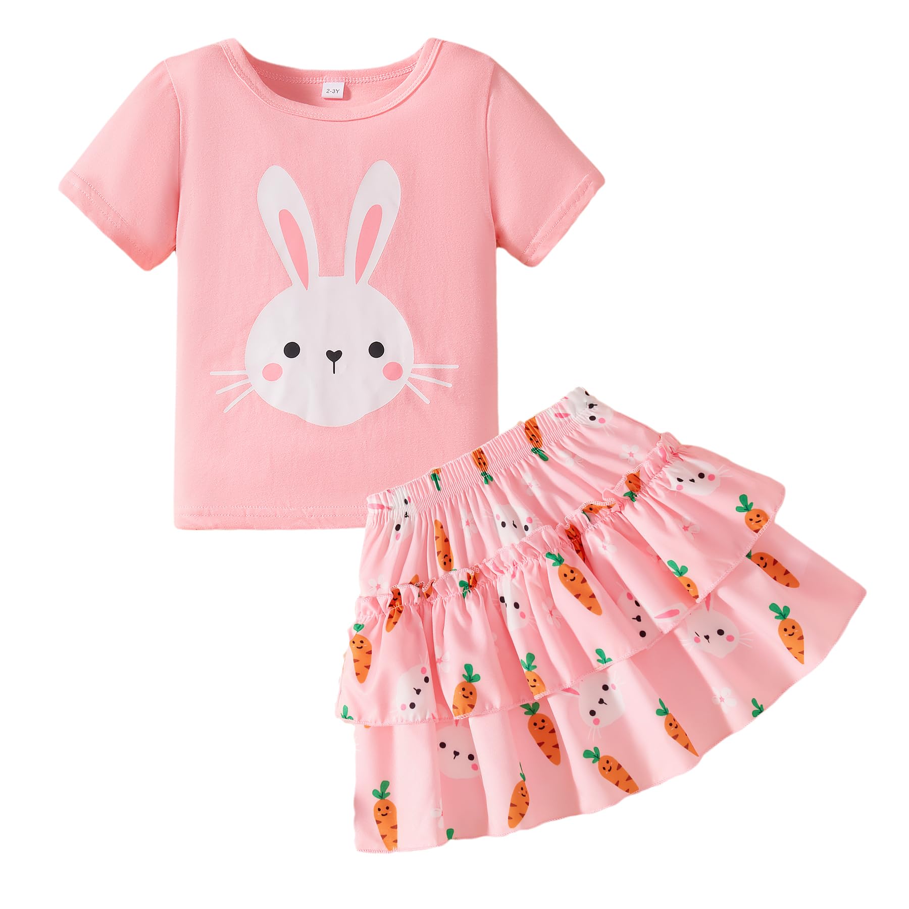 Material: Fashionable little girls' skirt outfit set, soft, lightweight, and breathable, gentle on your baby's skin. Features good stitching and durable craftsmanship. Feature: 2-piece girls' clothing set, including skirt and top, short-sleeve shirt paired with a shirred tiered skirt, featuring bunn