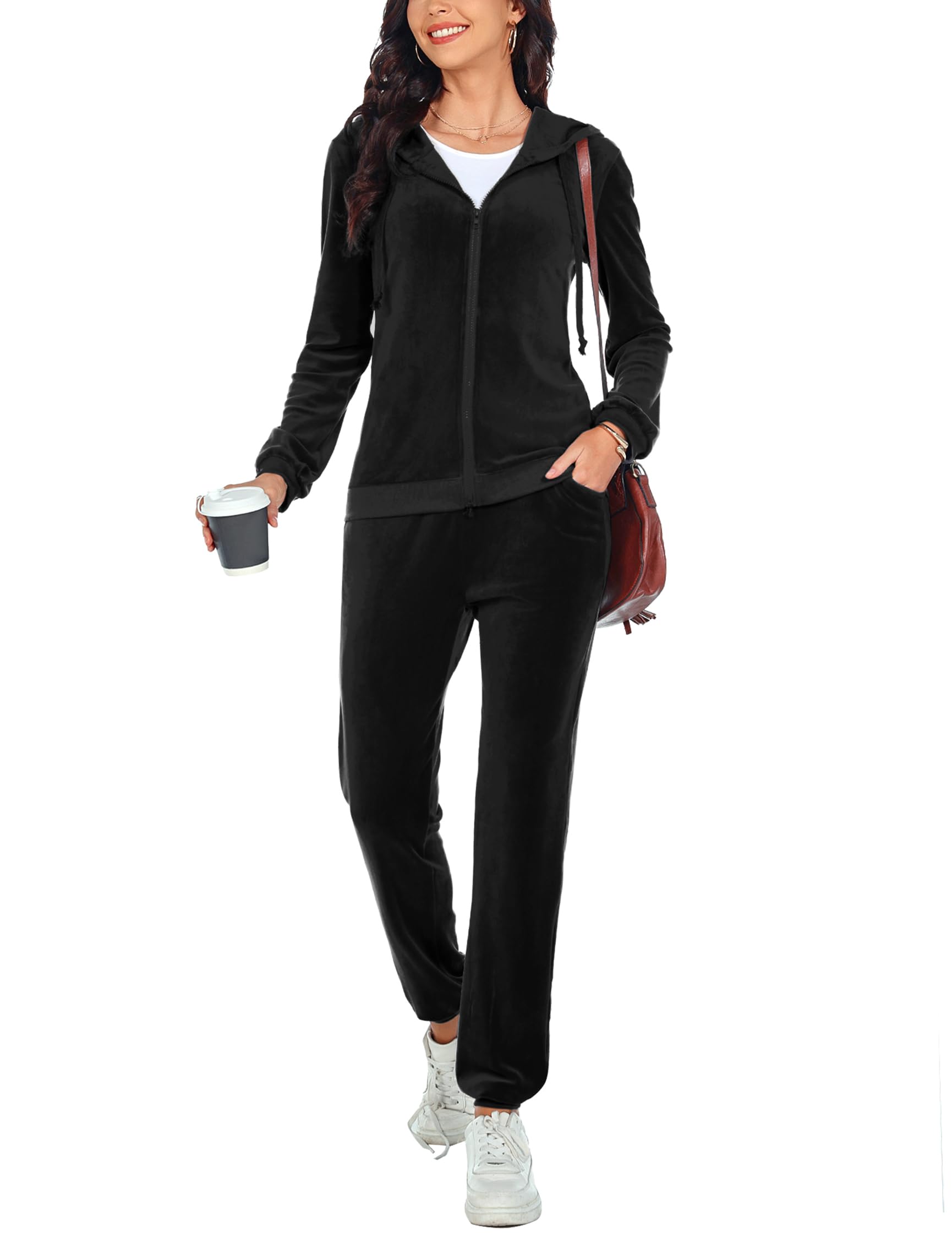 Velvet Material:Womens sweatsuits 2 piece set are made of 95% Polyester,5% Elastane,with a smooth surface,soft and comfortable feel,providing a luxurious and relaxing feeling all day long Casual Two Piece Set:This lounge set includes a comfortable zip up long sleeved hooded sweatshirt top and a pair