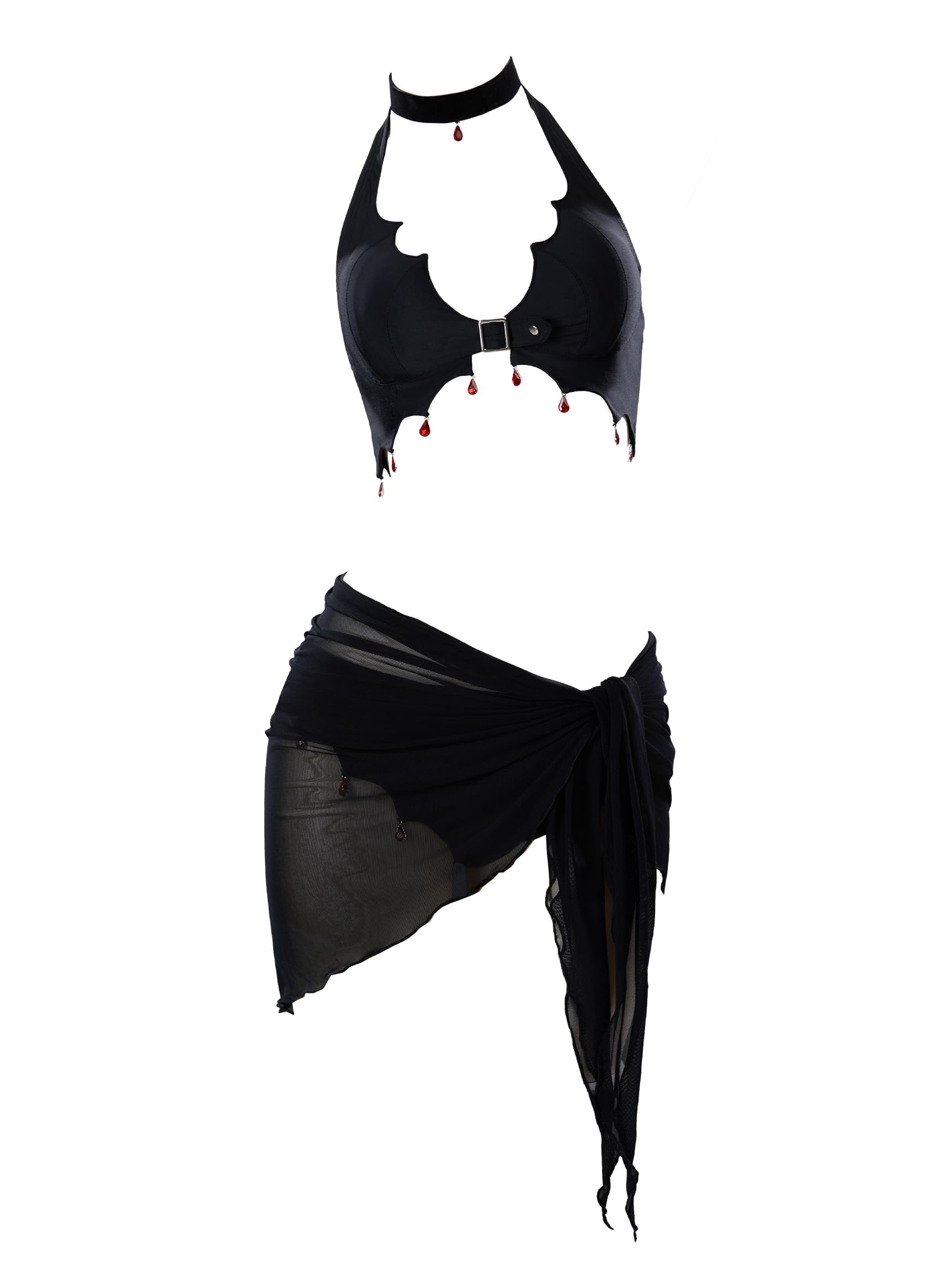 MEOWCOS Goth Bikini Bathing Suit Swimsuit Gothic Style Black Halter Bikini Set with Black Sarong Cover Up