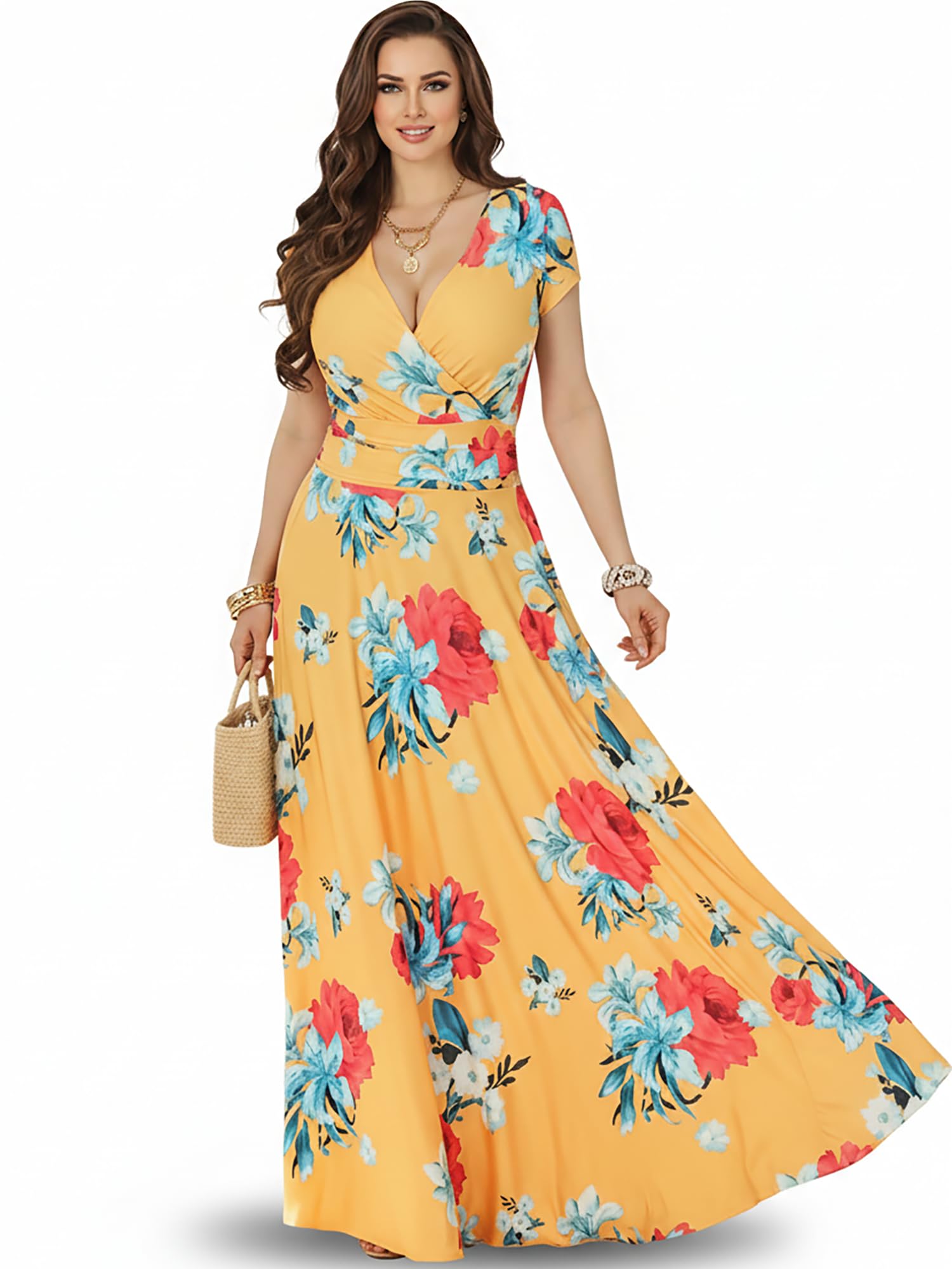 Plus sized flattering Yellow and Pink maxi dress; full figure slimming clothing; comfy big size dress; ladies short sleeved maxi dress; sexy curvaceous elegant womans clothes; loose fitting comfortable clothing; large sizing gowns with sleeves Cute chic full length daily wear Yellow and Pink dress;