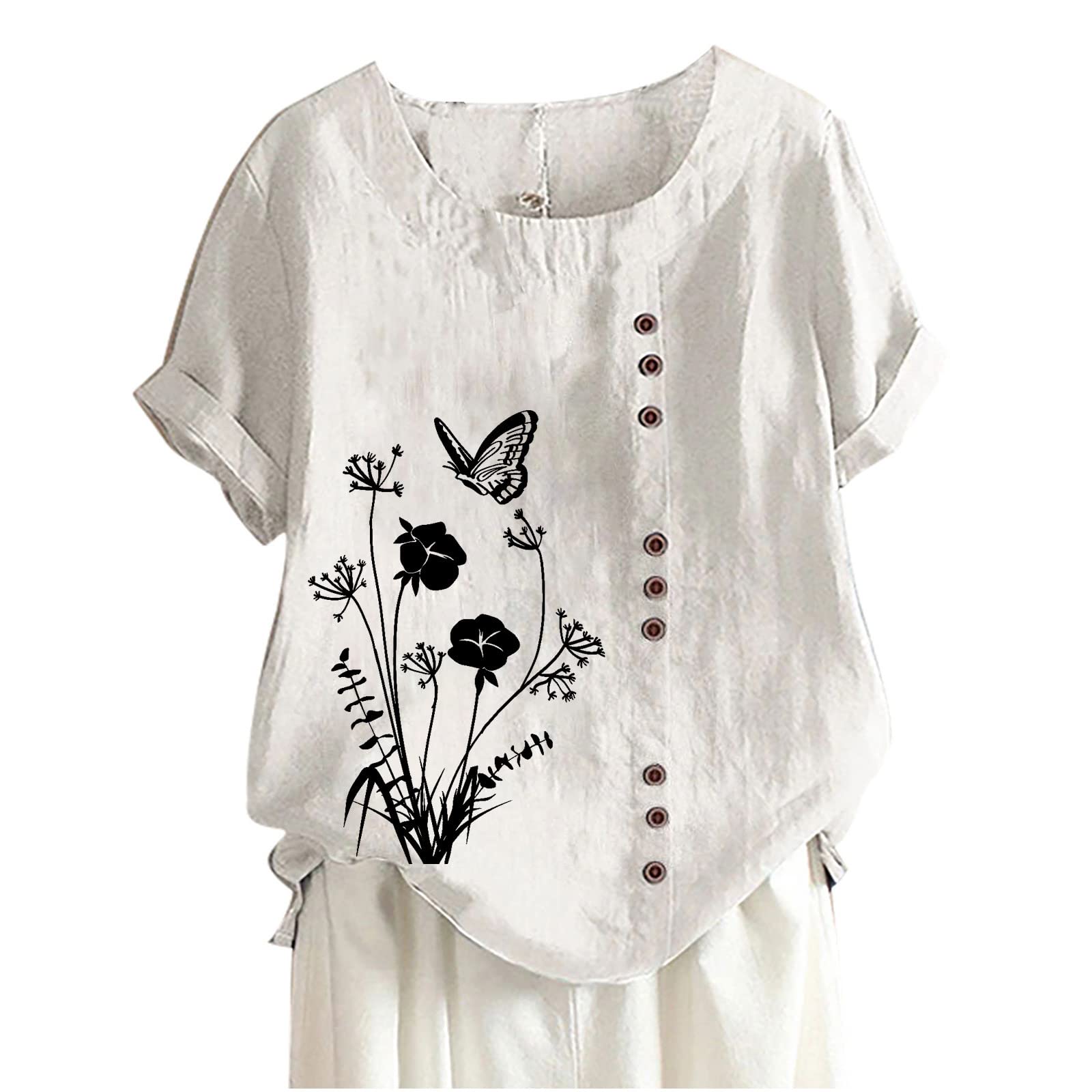 FOCLMP Women Dandelion Print Gauze Shirts Cotton Linen Short Sleeve Tops Casual Summer Blouses Tunic Trendy Vacation Clothing