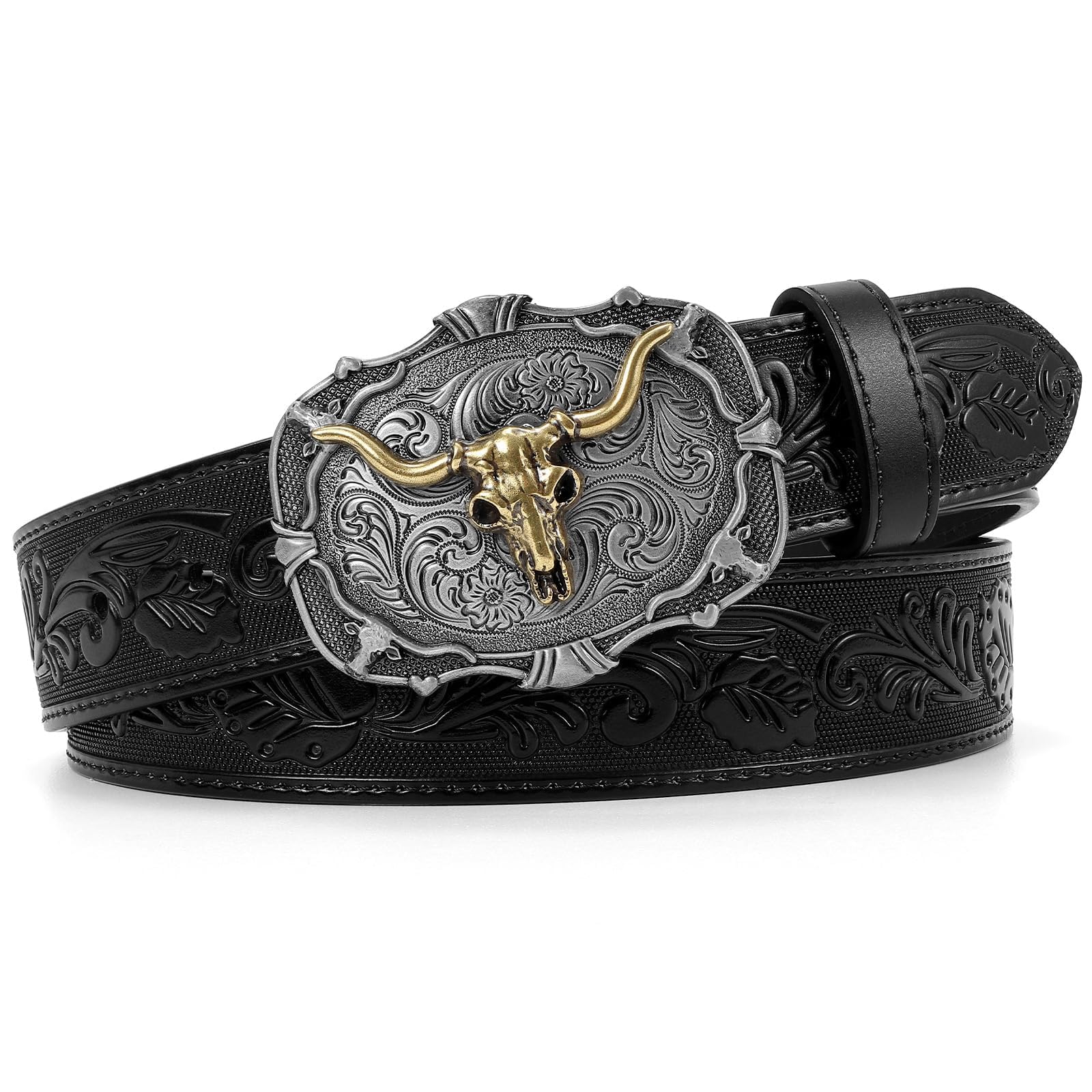 SANSTHS Cowboy Belts for Men Women Western Buckle Belt Cowboy Cowgirl Embossed Leather Belt for Jeans Christmas Gifts Belt