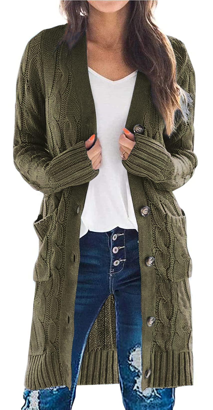 PRETTYGARDEN Long Sleeve Cable Knit Long Cardigan for Women 2026 Spring Winter Chunky Open Front Button Sweaters with Pockets