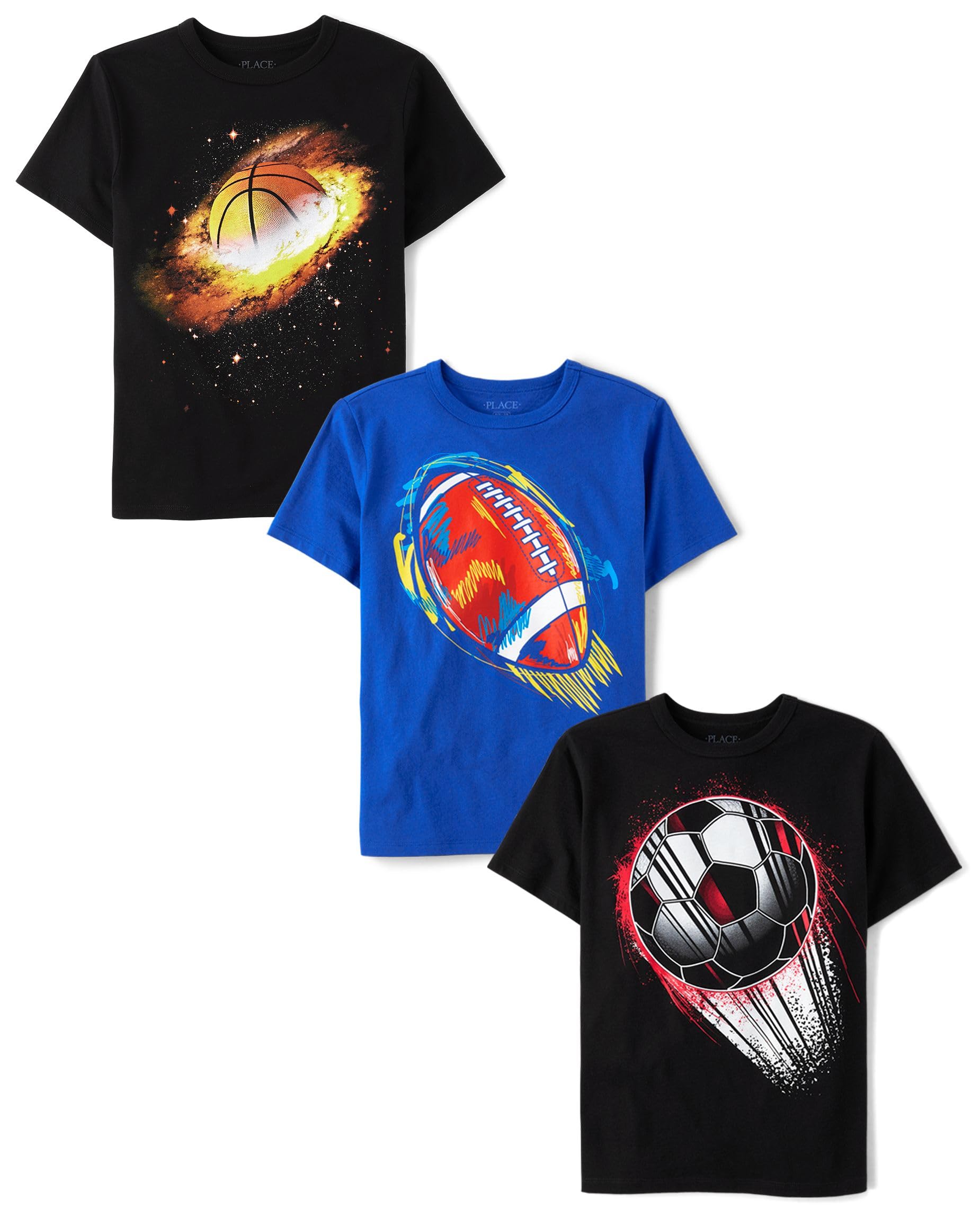 60% Cotton, 40% Polyester Imported FABRICATION: 60% cotton/40% polyester jersey, imported MULTIPACK: 1 basketball galaxy graphic design, 1 soccer ball graphic design, 1 football graphic design FIT & DESIGN: Rib-knit crew neck, short sleeves THE CHILDREN'S PLACE — We offer a huge selection of kid's