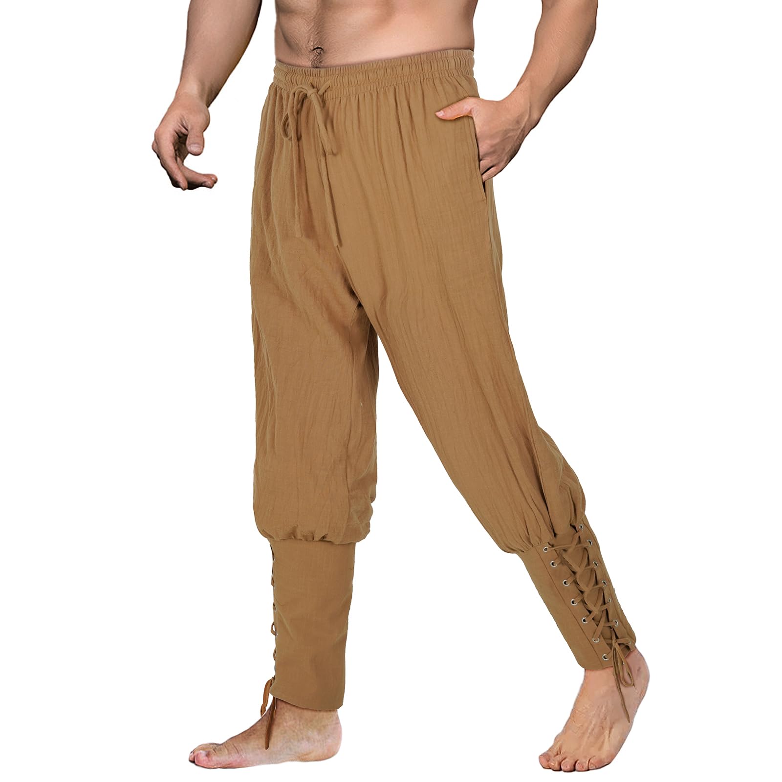 Material: 70% linen and 30% cotton, soft and breathable fabric, comfortable to wear One pirate pants is included The pirate pants with drawstrings at the waist, detachable drawstring cuffs on the calves, and adjustable drawstring at the ankles for easy wearing. They can be worn as pirate and Renaiss