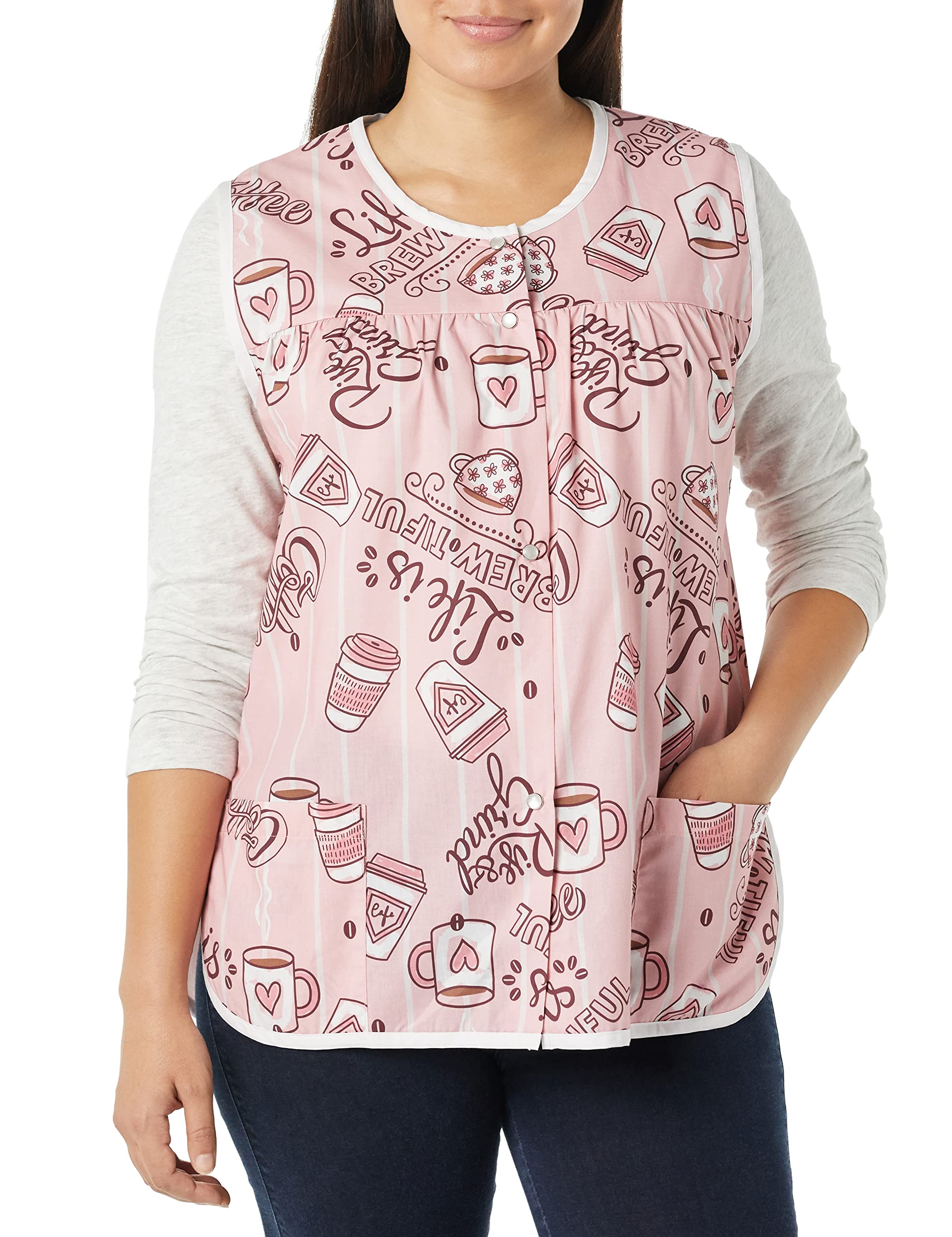 Protects your clothes: This sleeveless smock apron vest has a full front and back, making it a perfect beautician smock, chef smock, kitchen smock, teacher apron uniform or art smock Designed for easy on and off: Our aprons for women have a comfortable, relaxed fit. The snap-front apron has no diffi