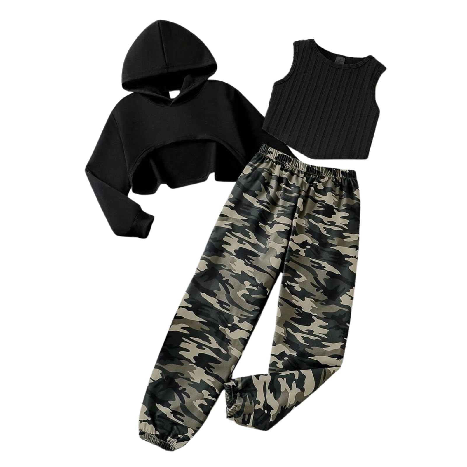🌟 Soft & Cozy Fabric : This girls clothing set is made from soft, breathable fabric that keeps her warm and comfy throughout fall and winter. A perfect option for girls clothing size 5 to 9 and everyday kids clothes. 🎨 Trendy 3-Piece Set : Includes a solid cropped hoodie, camo print pants, and