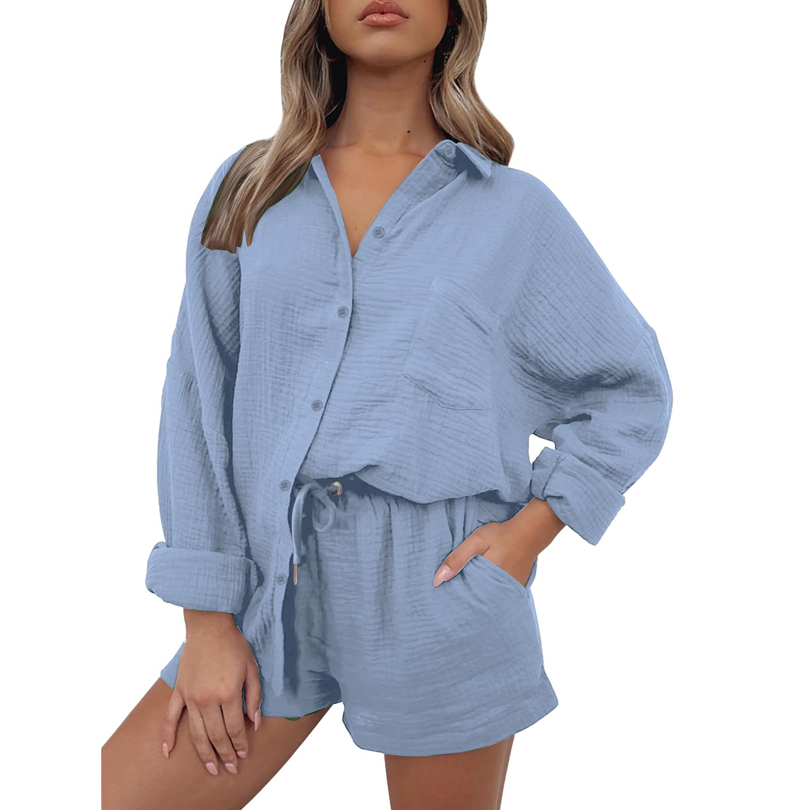 ZWRXW Womens 2 Piece Sets Cotton Linen Short Sets Oversized Shirts and Shorts Beach Vacation Two Piece Outfits Lounge Wear