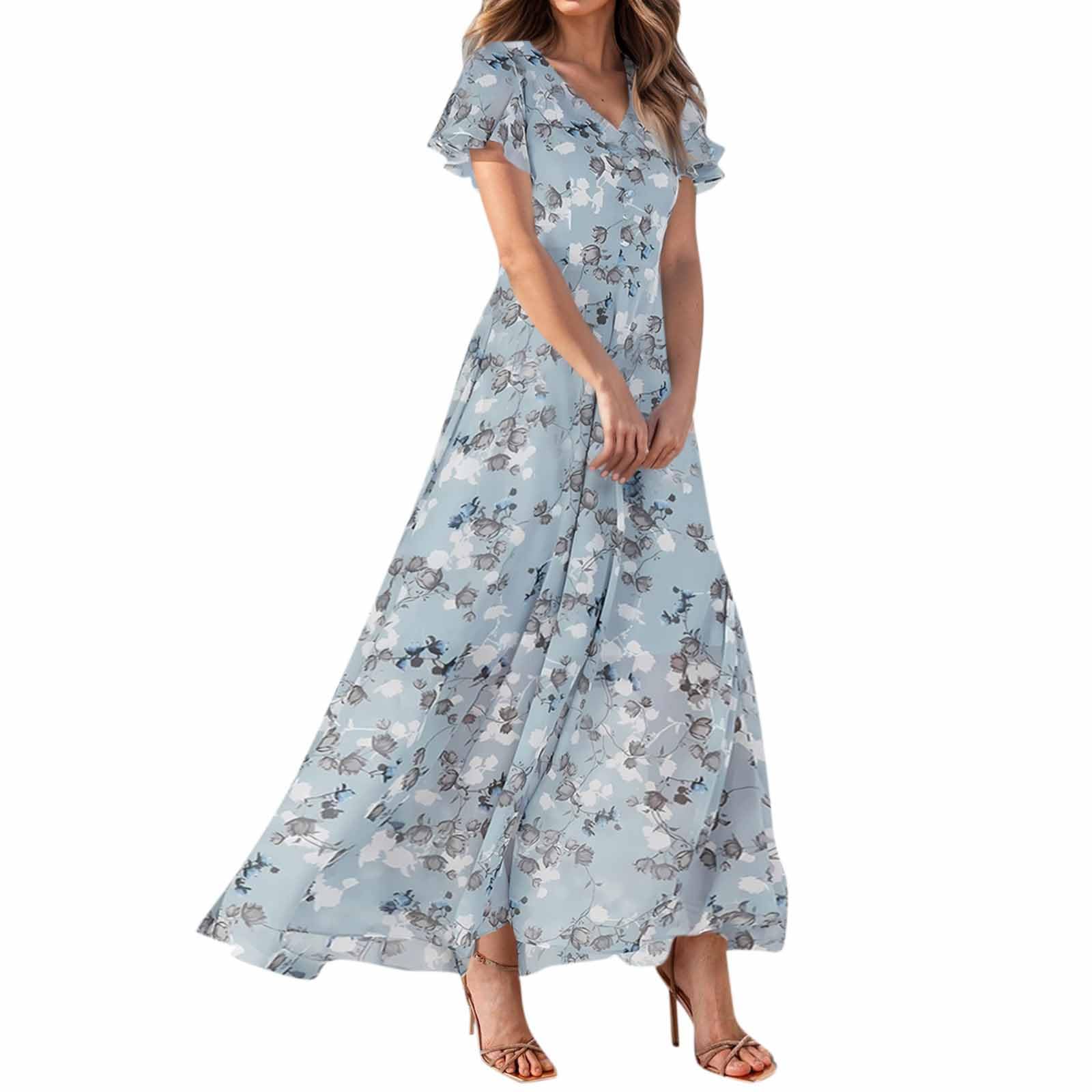 Maxi Floral Dress for Women Summer Chiffon Long Dress V Neck Flutter Sleeve Garden Party Dresses Flowy Beach Dress