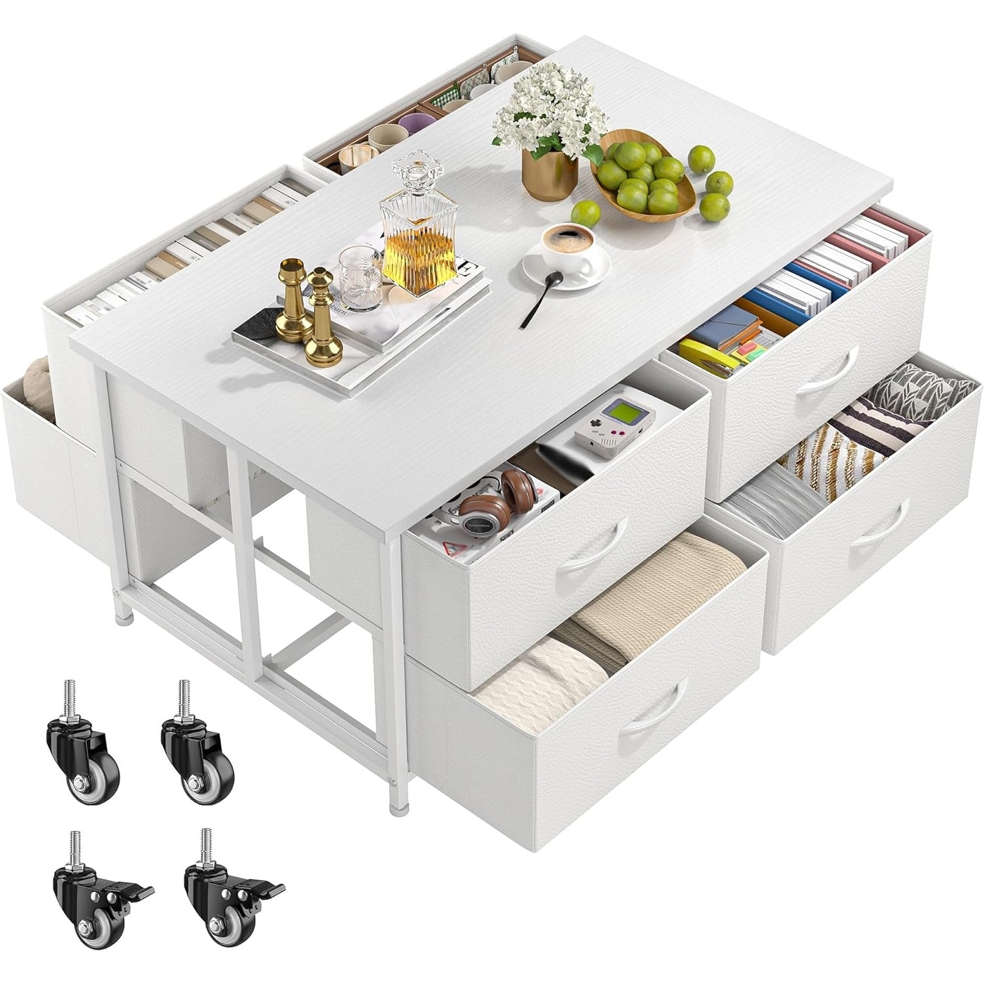 Modern Coffee Table with Storage, 4 Wheels & Hidden Space, Fabric Drawer for Living Room, Bedroom, Office - White