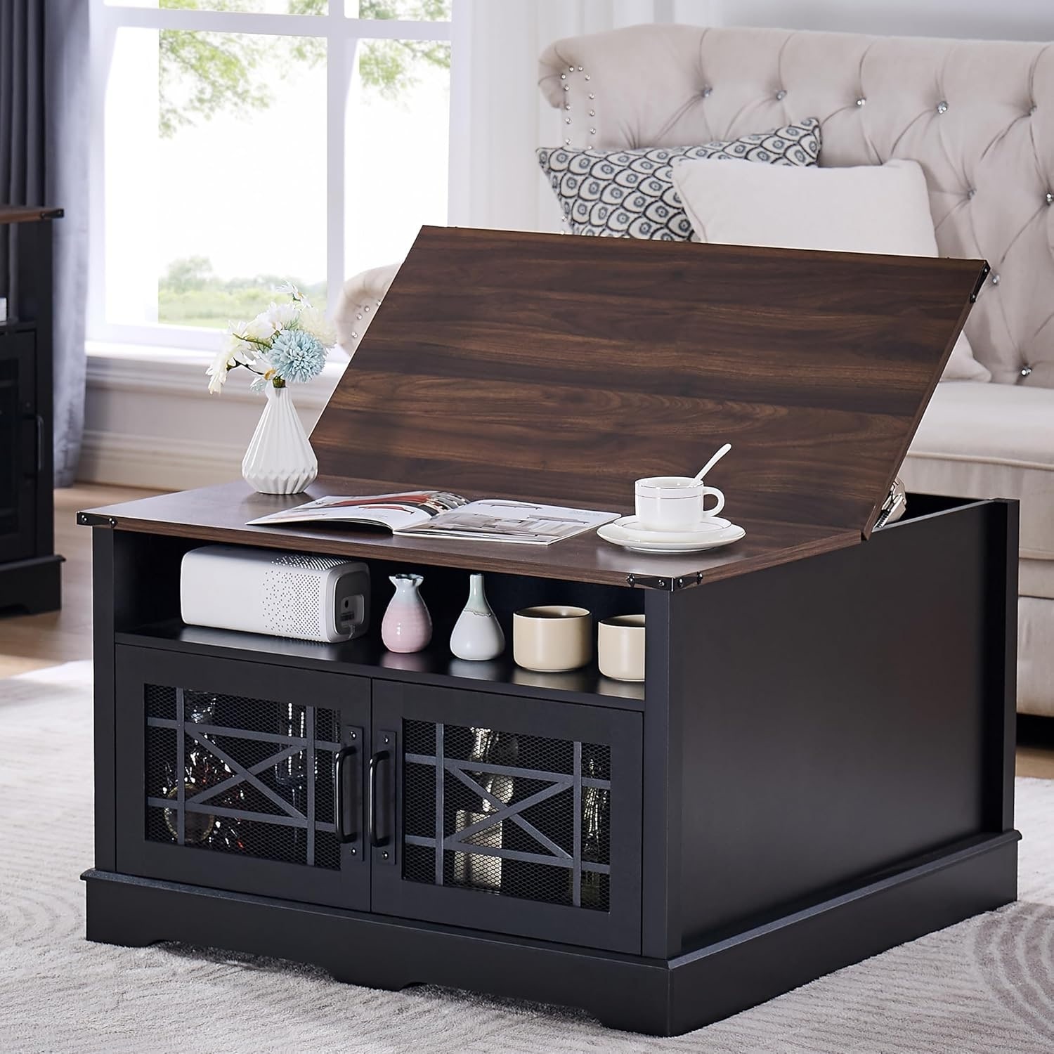 Farmhouse Coffee Table with Storage, Lift-top Design, Hidden Compartment, Rustic Black Living Room Center Table