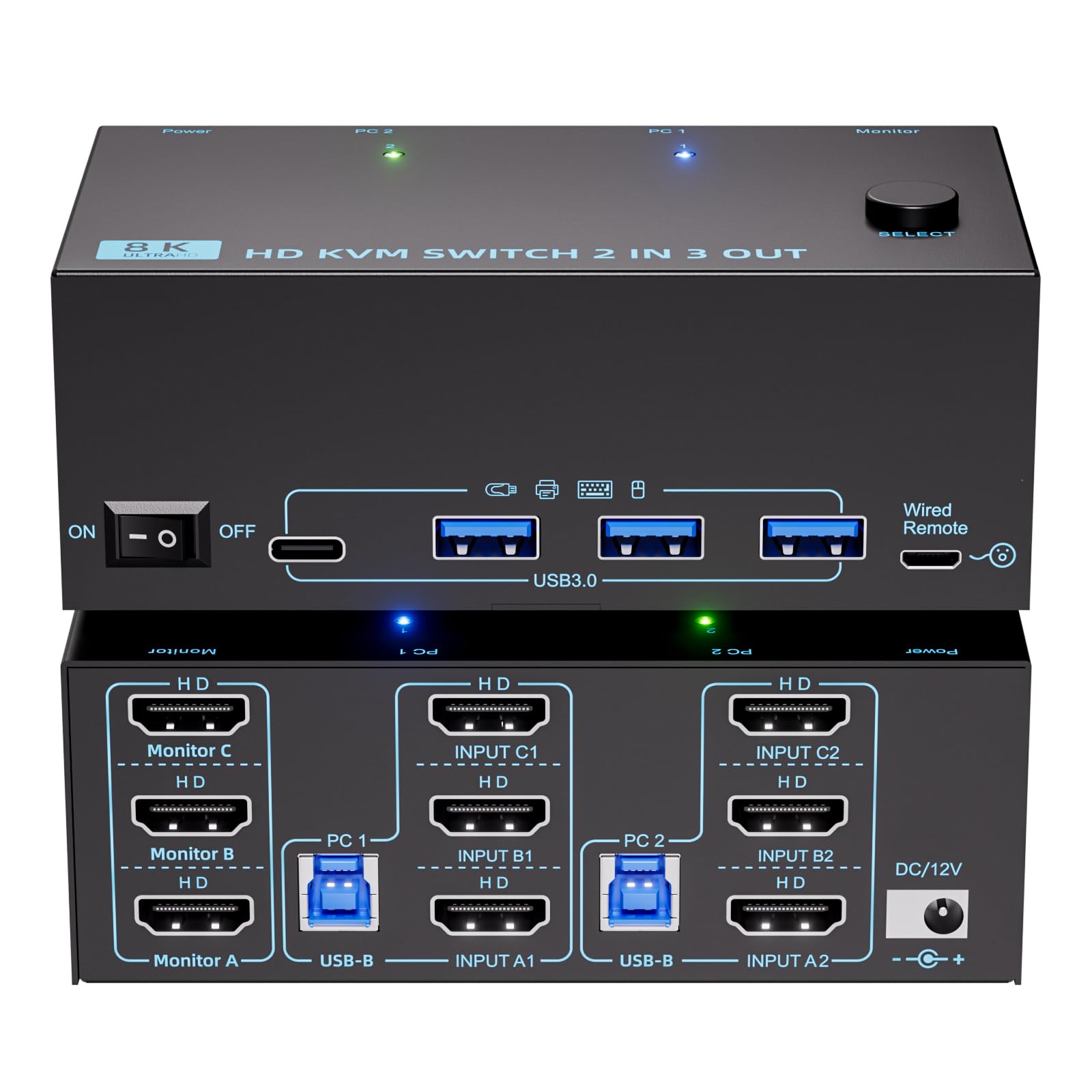 KVM Switch 3 Monitors 2 Computers 8K@60Hz/4K@120Hz, HDMI KVM Switches for 2 PC Sharing Triple Monitor and Keyboard Mouse with Power Adapter, Wired