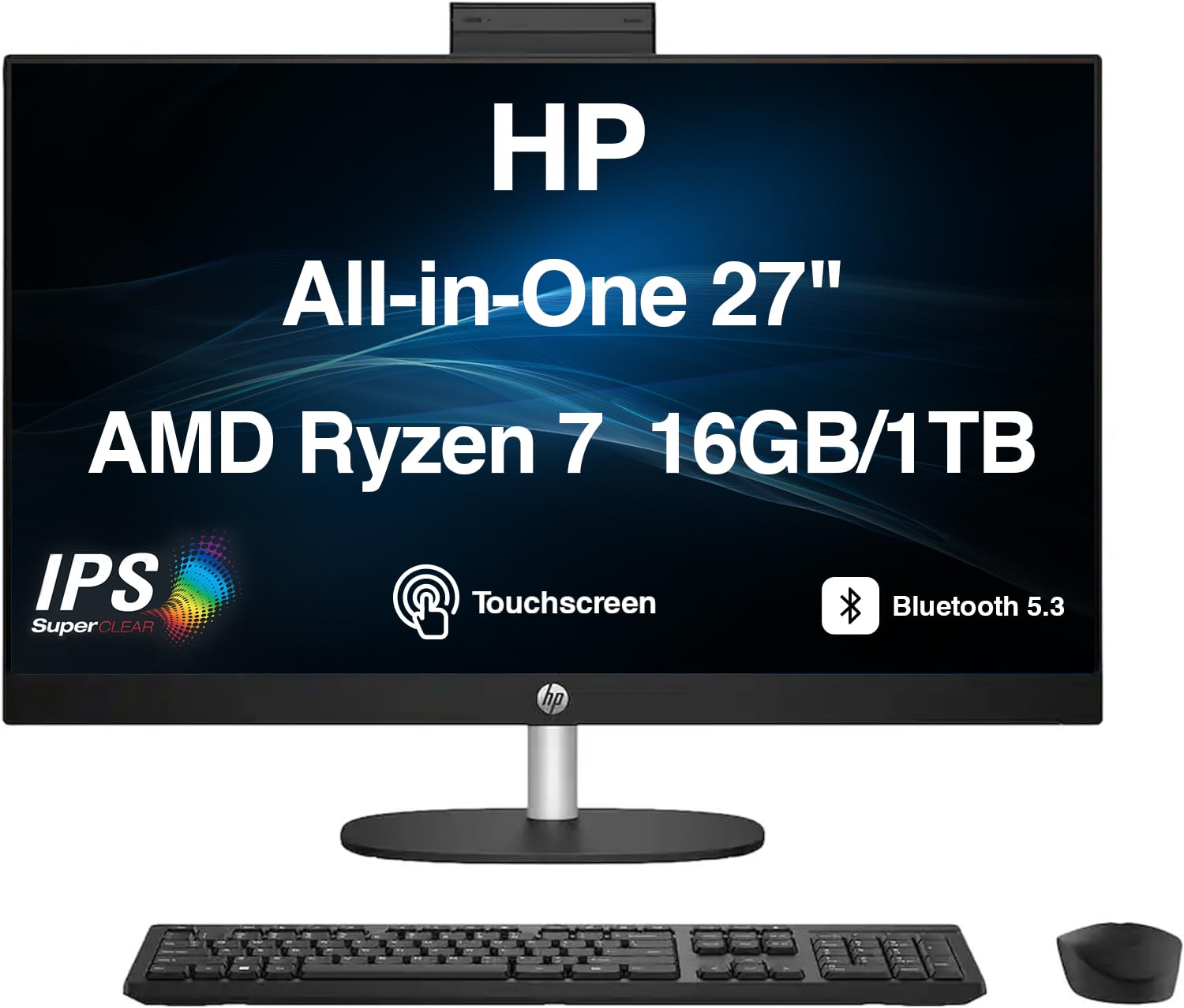 HP 27 Business All-in-One 27" Touchscreen IPS FHD Display (AMD Ryzen 7 7730U, 16GB DDR4, 1TB PCIe SSD, AMD Radeon, WiFi 6, Webcam, Bluetooth 5.3, Win