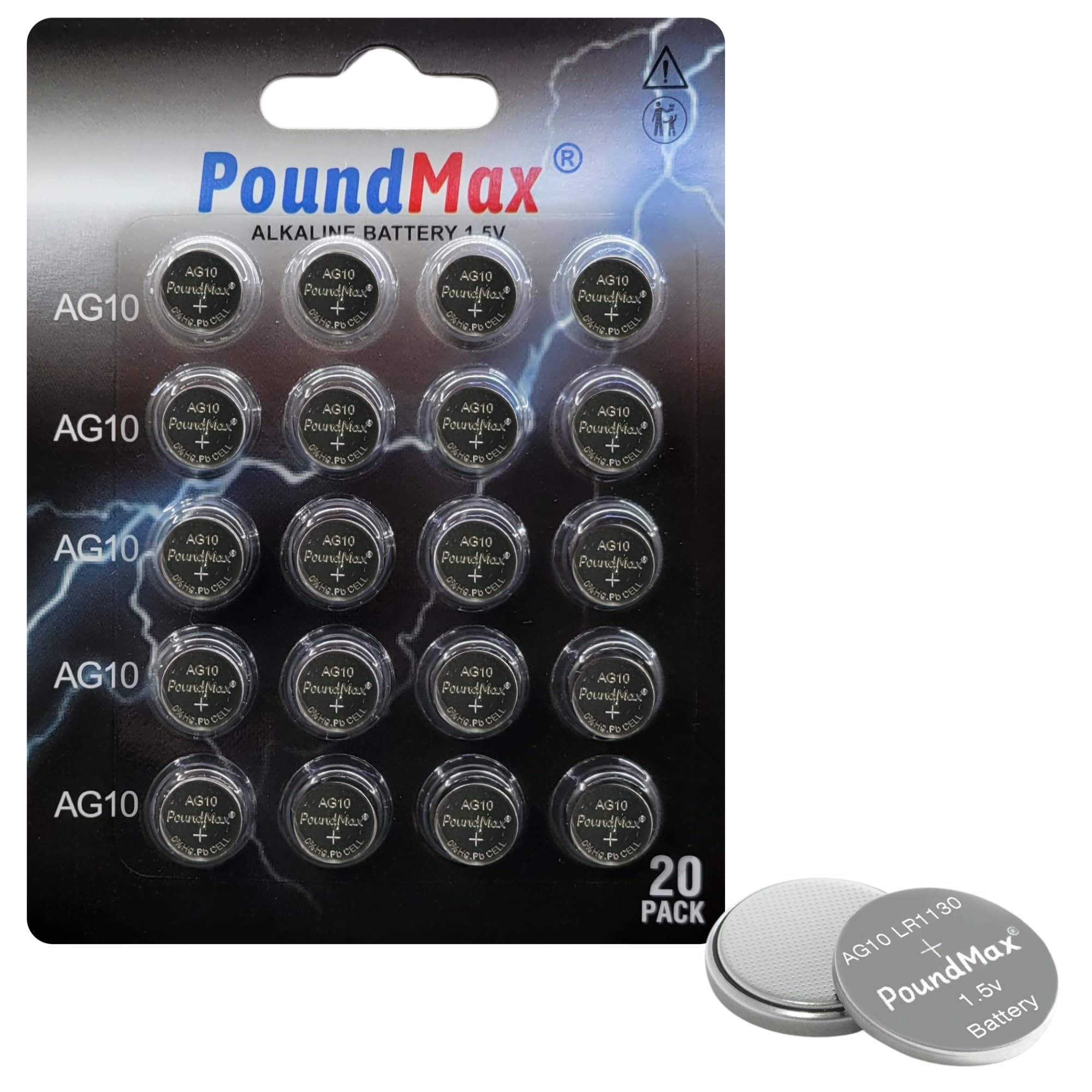 PoundMax AG10 LR1130 Alkaline Coin Cell Battery 1.5V Long-Lasting Reliable Power for Watches, Calculators, Electronic Toys - Leak-Proof Design, Long