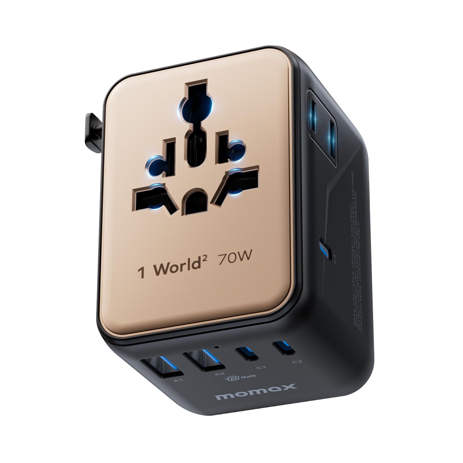 MOMAX Mini 7-in-1 Universal Travel Adapter, GaN 70W Dual AC, 3 USB-C PD & 2 USB-A QC, International Power Charger for 200+ Countries – Compact Travel