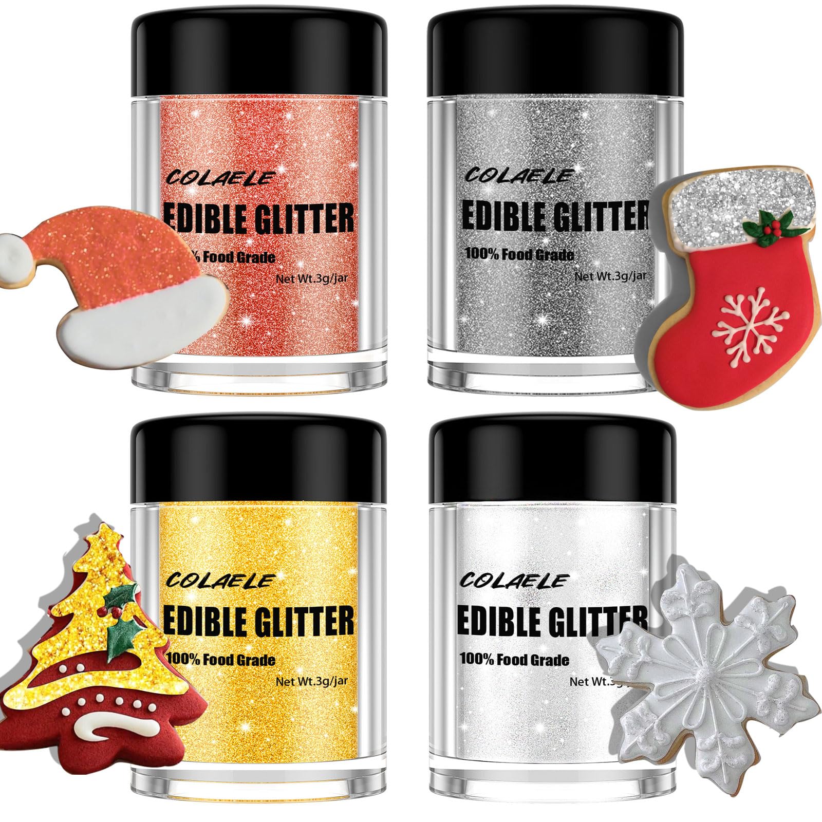 4 Edible Glitter Dust Colors Are Available - Includes: Rose gold, Gold, White, Silver. 3 Grams Each Jar. It is an ideal choice set for Halloween, Christmas, Wedding, and more holidays to decor. Made of Premium Food Grade Material - 100% MSDS-certified food ingredients! Chirstmas Edible Glitter Set f