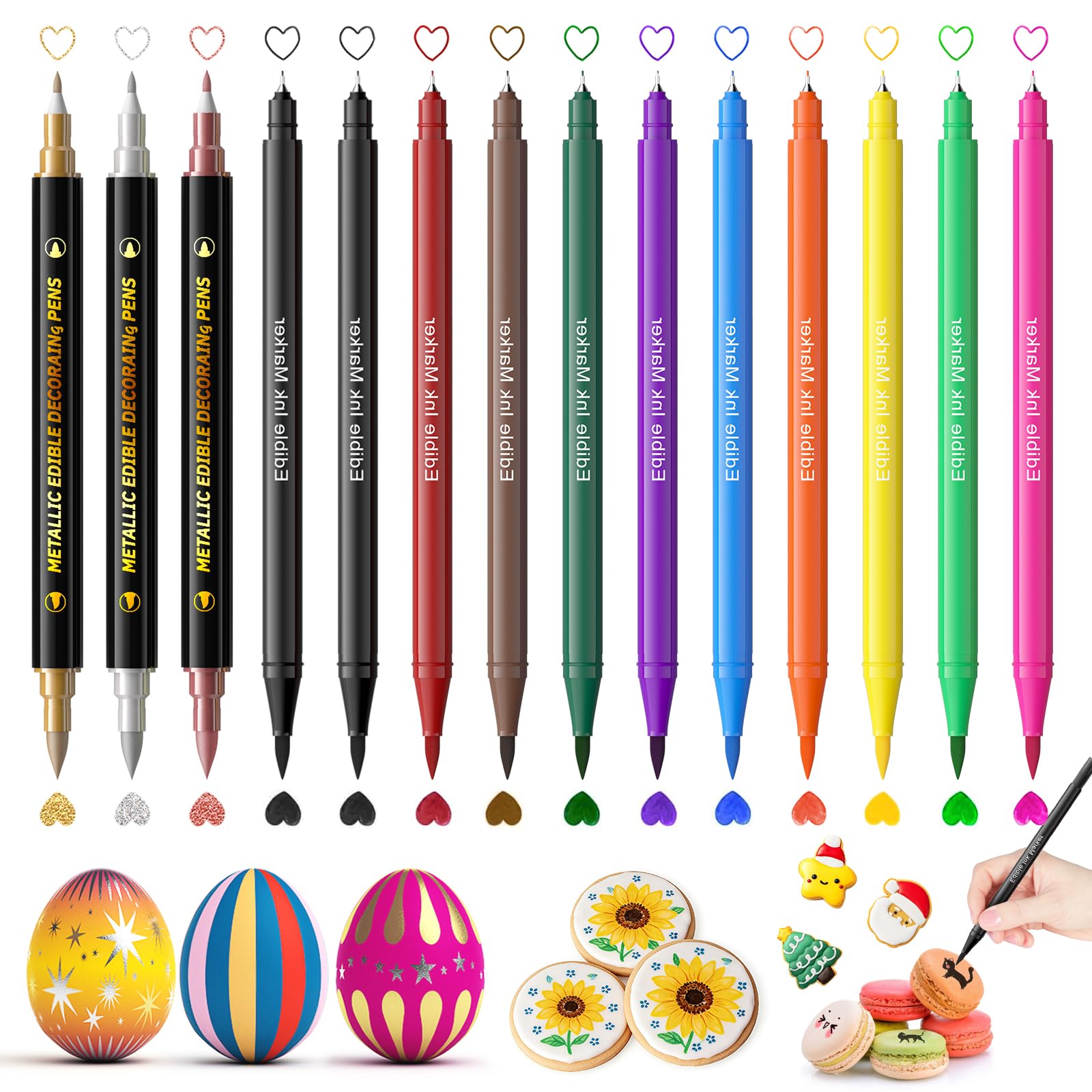 【Upgraded Edible Marker】Upgraded 3PCS edible metallic markers use mica-based pearlescent pigments, delivering more vibrant colors than traditional edible markers. They help create beautiful shimmering patterns on frosted cookies, cakes, and chocolates. The 11PCS edible markers feature a double-s