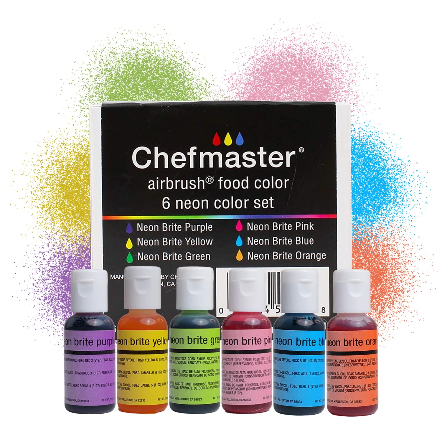 Chefmaster - Neon Airbrush Kit - Airbrush Food Coloring - 6 Pack - Highly-Pigmented, Vibrant Colors, Works With Any Airbrush Tool, Fade-Resistant