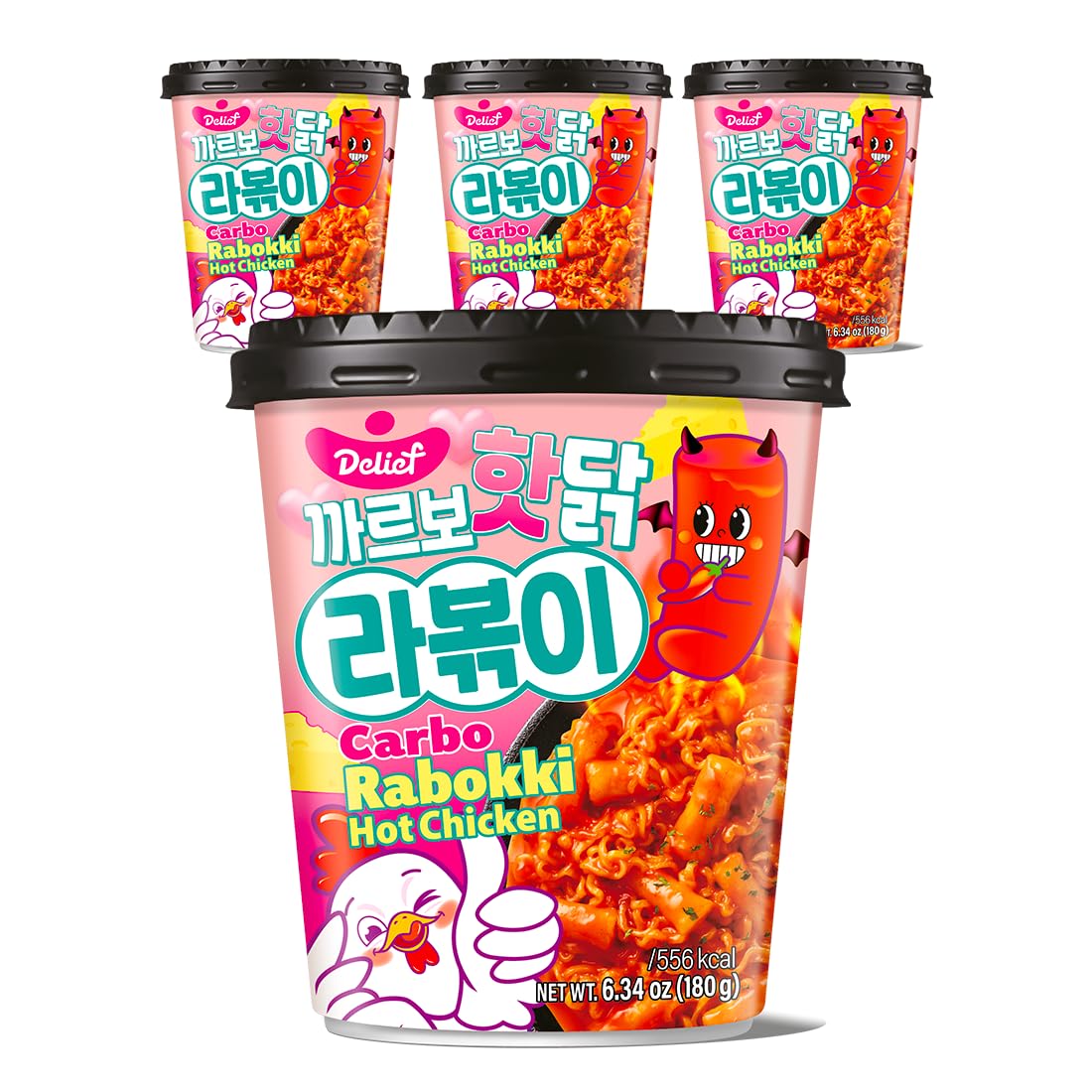 DELIEF Rabokki Carbo Hot Chicken Flavor 165g/6.34oz - Pack of 4, Korean Street Food, Ramen Noodle and Tteokbokki Rice Cake Combined in 1 - Quick and