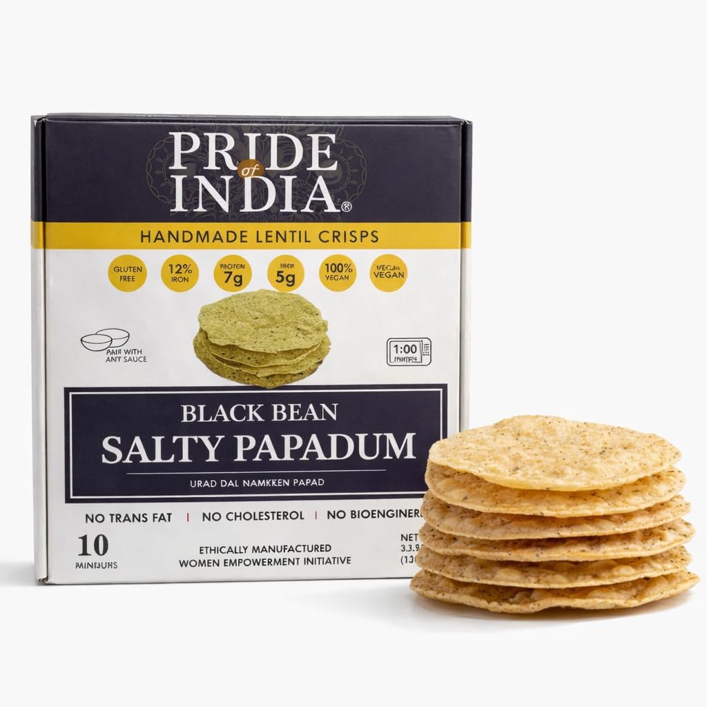 Pride Of India - Salty Black Bean Namkeen Papadum Lentil Crisp - 10 count (3.53oz - 100gm) - Lentil Chips, Gluten-Free Crackers, Healthy Snacks,
