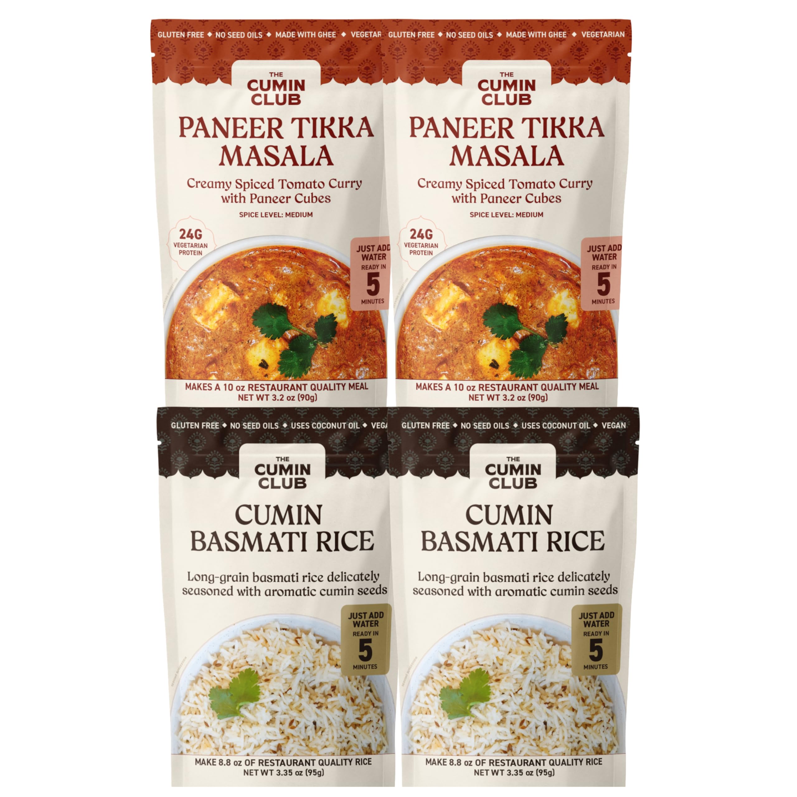 Cumin Club Indian Meals | Freeze Dried Backpacking & Camping Food | Gluten Free | High Protein | 2 Packs of Paneer Tikka & 2 Packs of Cumin Rice |