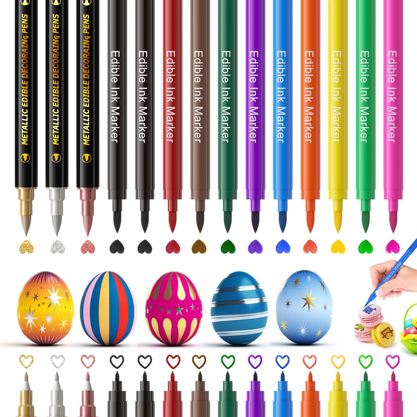 ใUpgraded Edible MarkerใUpgraded 3PCS edible metallic markers use mica-based pearlescent pigments, delivering more vibrant colors than traditional edible markers. They help create beautiful shimmering patterns on frosted cookies, cakes, and chocolates. The 11PCS edible markers feature a double-s