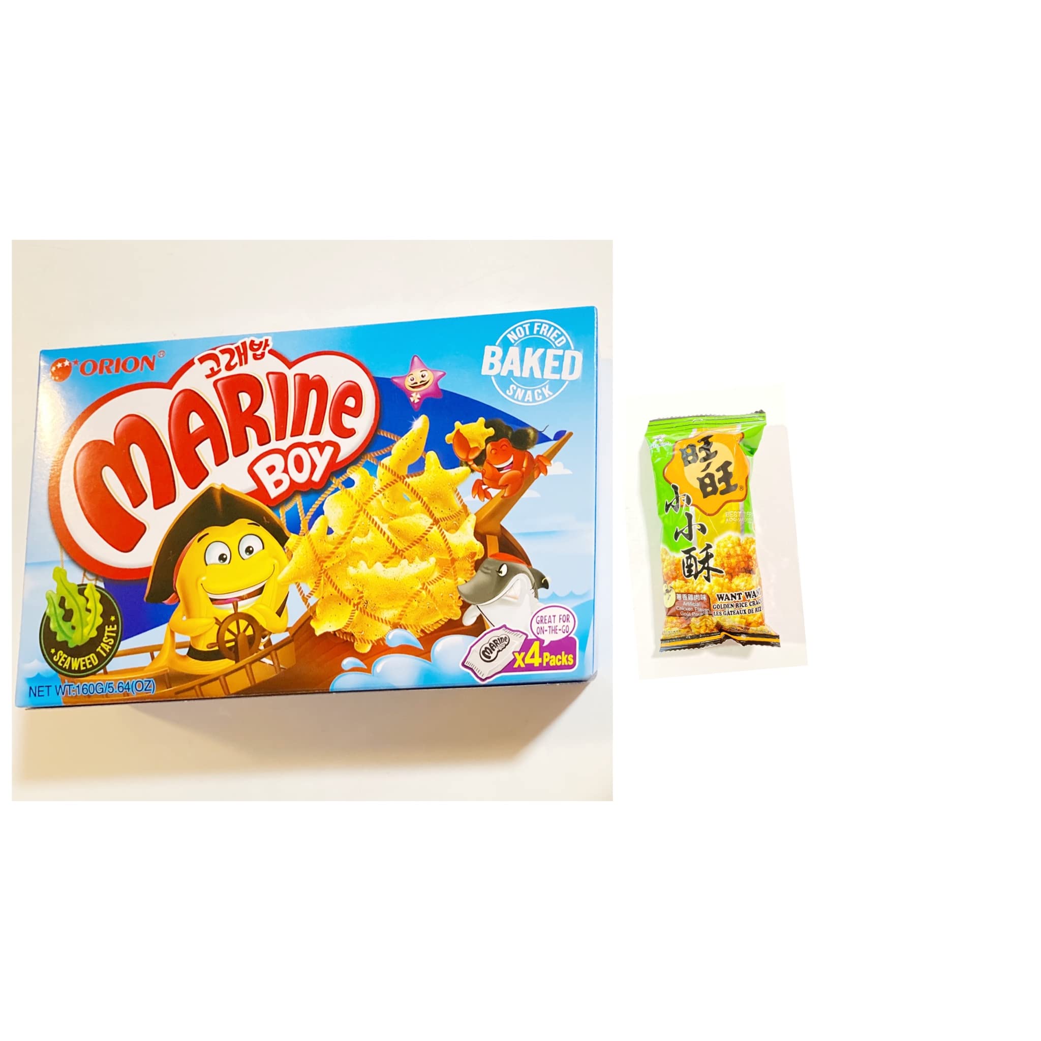 Orion Marine Boy Baked Snack ( Seaweed Taste)5.64 Oz AND Want Want Golden Rice Cracker (Artificial Chicken Flavor)