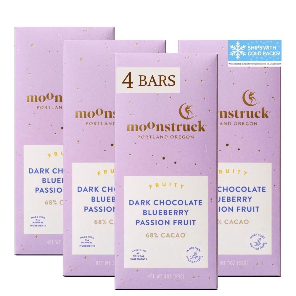 Moonstruck Chocolate Blueberry and Passion Fruit Dark Chocolate Bar, 68% Cacao, 3.0oz (Pack of 4)