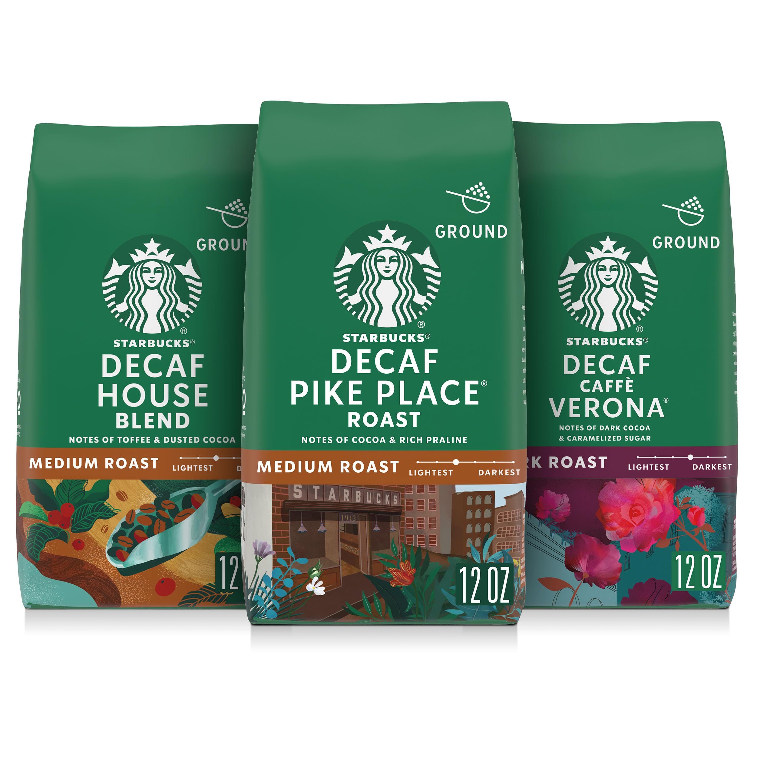 PREMIUM GROUND COFFEE: Enjoy the Starbucks coffee you love at home with three 12-ounce bags of Starbucks decaffeinated medium and dark roast ground coffees BALANCED: Starbucks Decaf Pike Place Roast is a well-rounded and medium-bodied blend of Latin American coffees with subtly rich notes of coco