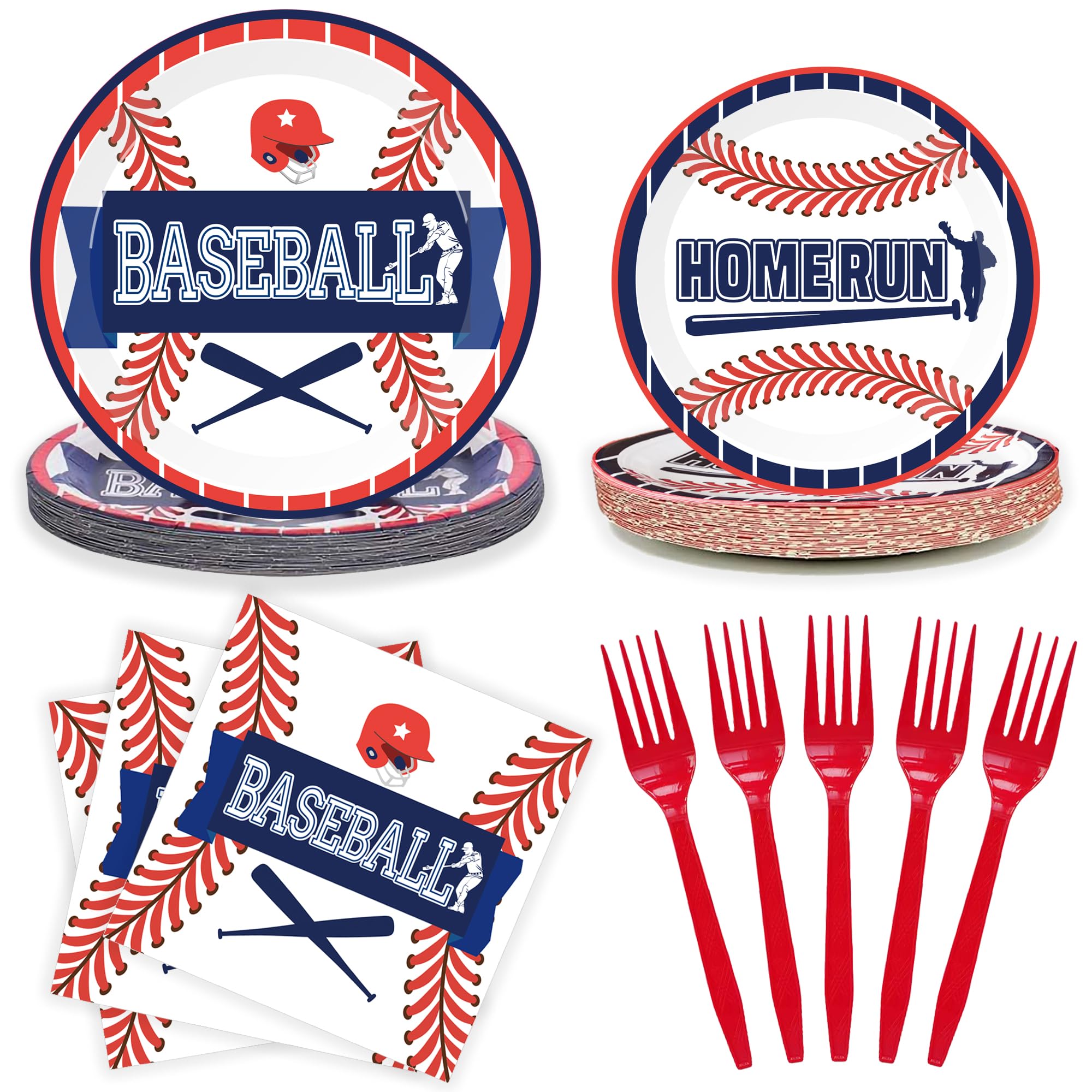 Complete Baseball Birthday Party Supplies - Host the perfect baseball party with our all-inclusive tableware set for baseball party decorations, featuring 50 baseball party plates (25 dinner paper plates and 25 dessert paper plates), 25 baseball napkins and 25 red plastic forks. Ideal for a memorabl