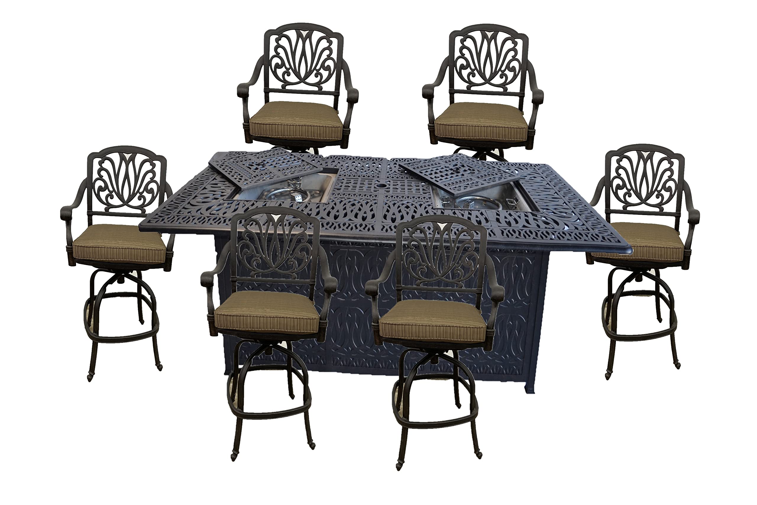Includes: [1] Elisabeth double-fire-pit bar height table 44"W x 84"L x 40"H; [6] Elizabeth 360-Swivel Bar Stools with Olefin Walnut Cushions Five Stage Powder Coated Finish - Solid Cast Aluminum Frame - Never Rust Antique Bronze Finish (close to black with brushes of bronze). 2.5" umbrella hole. 300