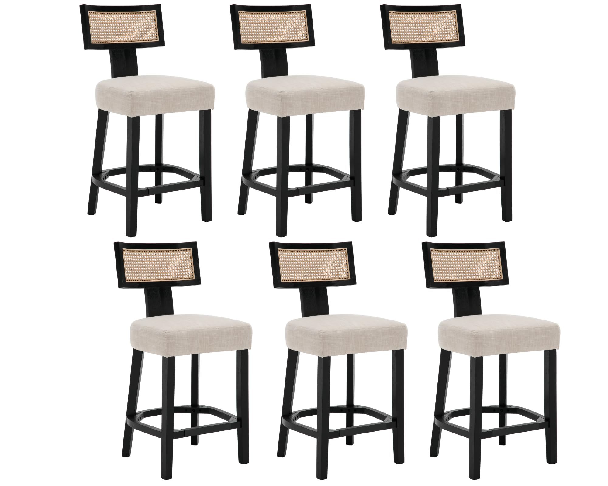 VESCASA Counter Height Barstools with Black Wood Legs, 26.5" H Linen Upholstered Counter Stool Chairs with Rattan Back Footrests for Kitchen Island,