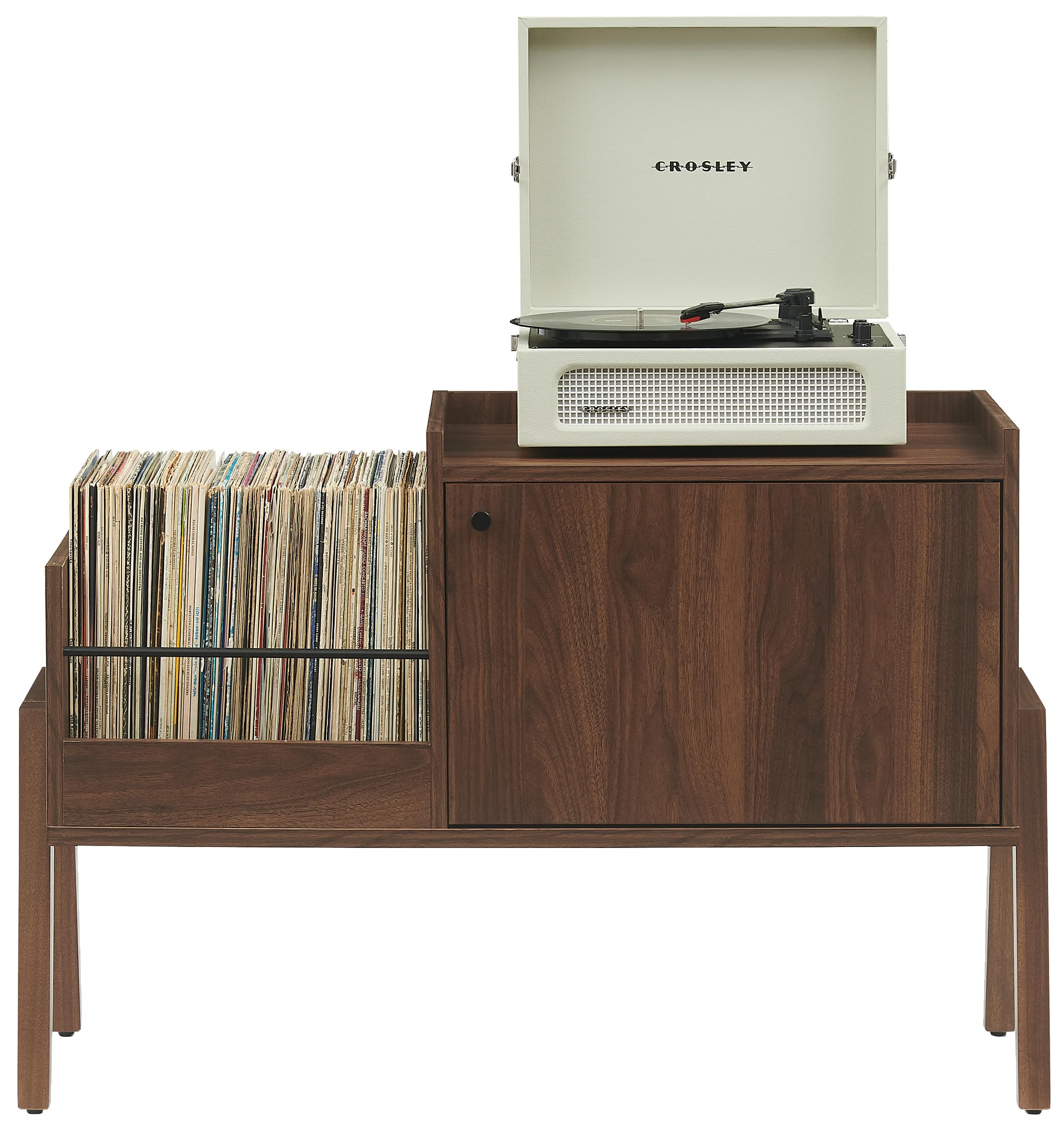MID-CENTURY MODERN LOOK: A walnut finish and black metal hardware give this record player stand a warm, retro feel. Tapered legs with adjustable levelers add stability and style. VERSATILE VINYL STORAGE: This cabinet has a thoughtful layout with two distinct storage areas: a crate-style shelf that h