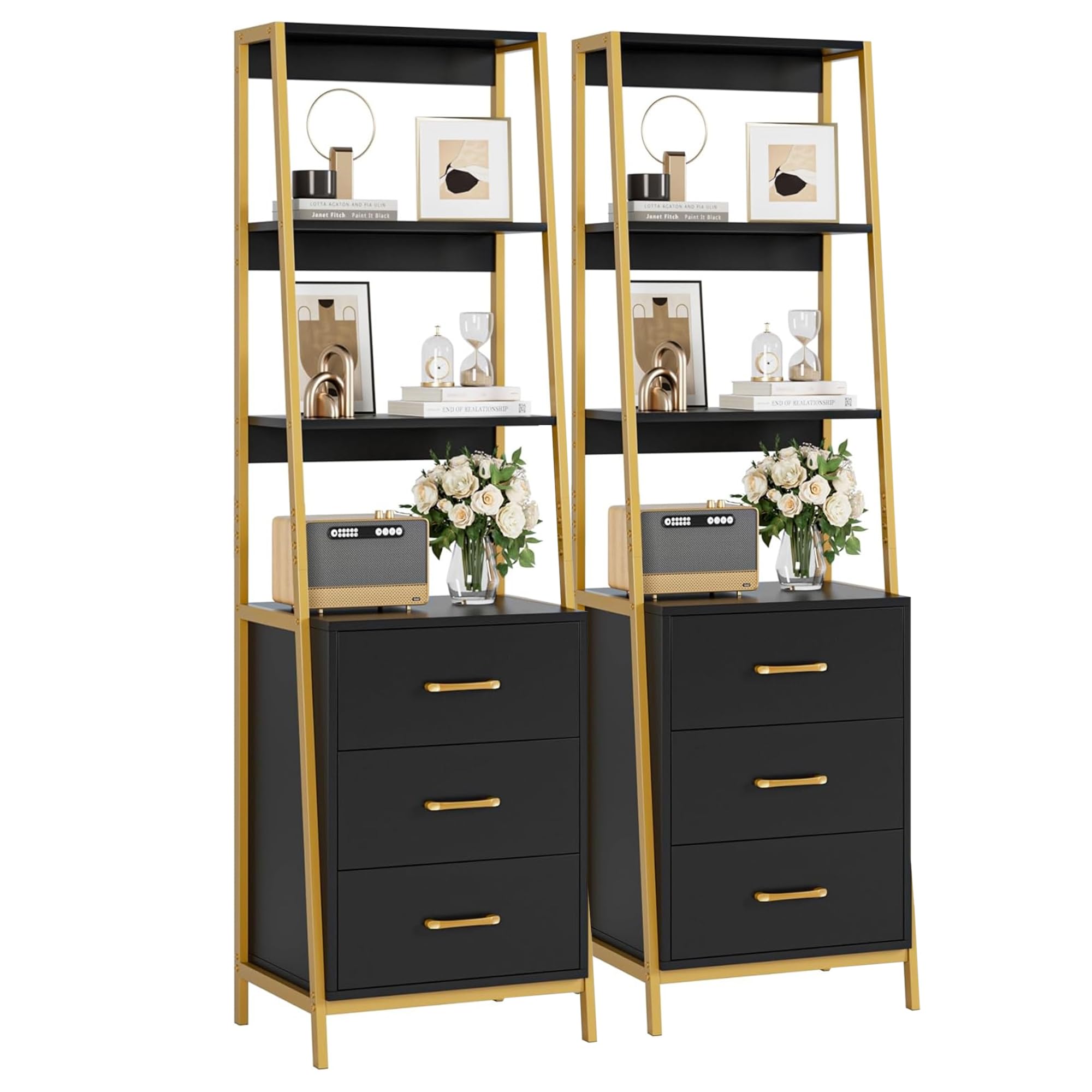 HITHOS 4-Tier Bookshelf, Tall Bookcase with 3 Wooden Drawers, Modern Ladder Book Shlef Storage Organizer for Living Room, Entryway, Office, Black Gold