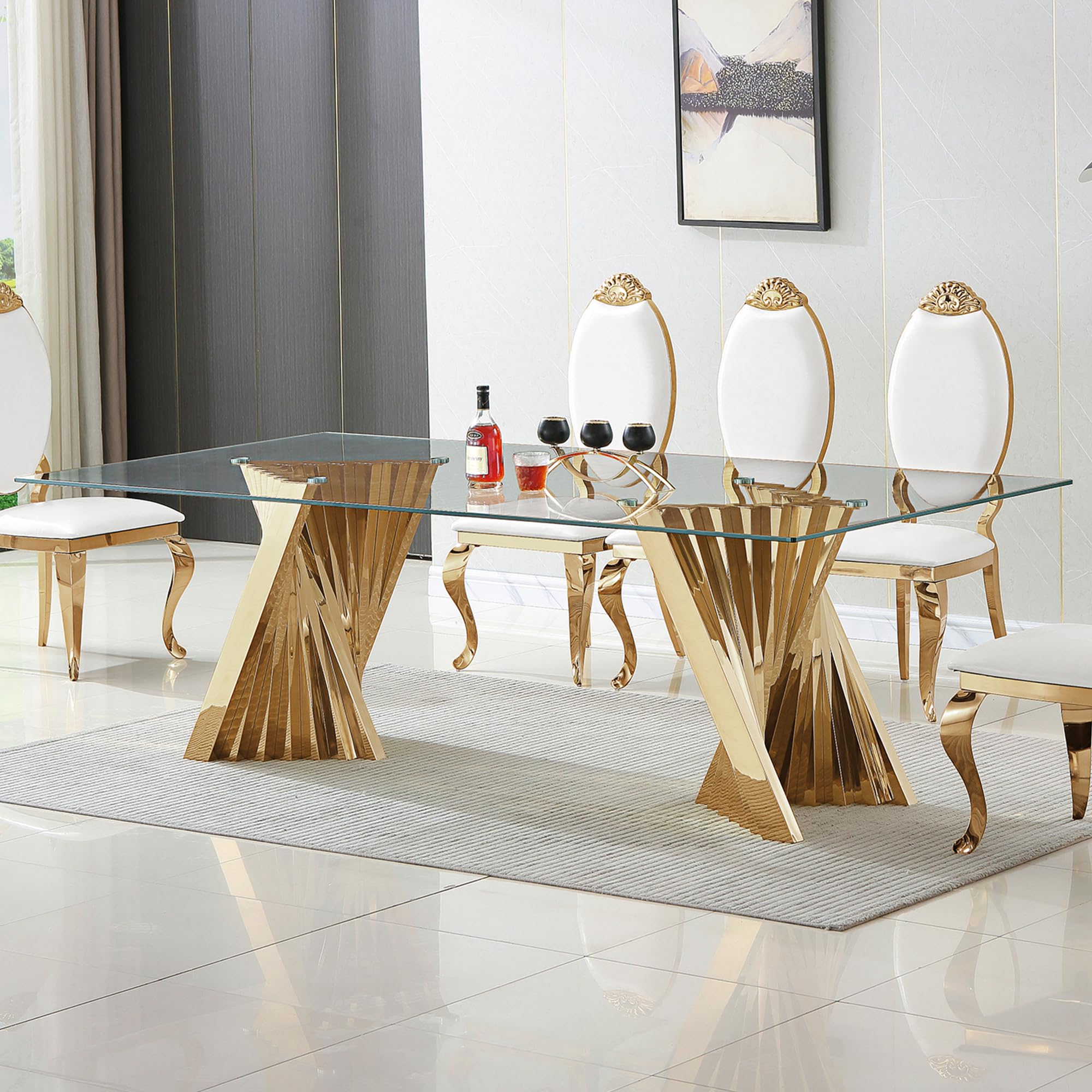AMHDDT 94" Glass Dining Table for 8-10, Large Luxury Kitchen Table with Tempered Glass Minimalist Tabletop and Gold Stainless Steel Pedestal for