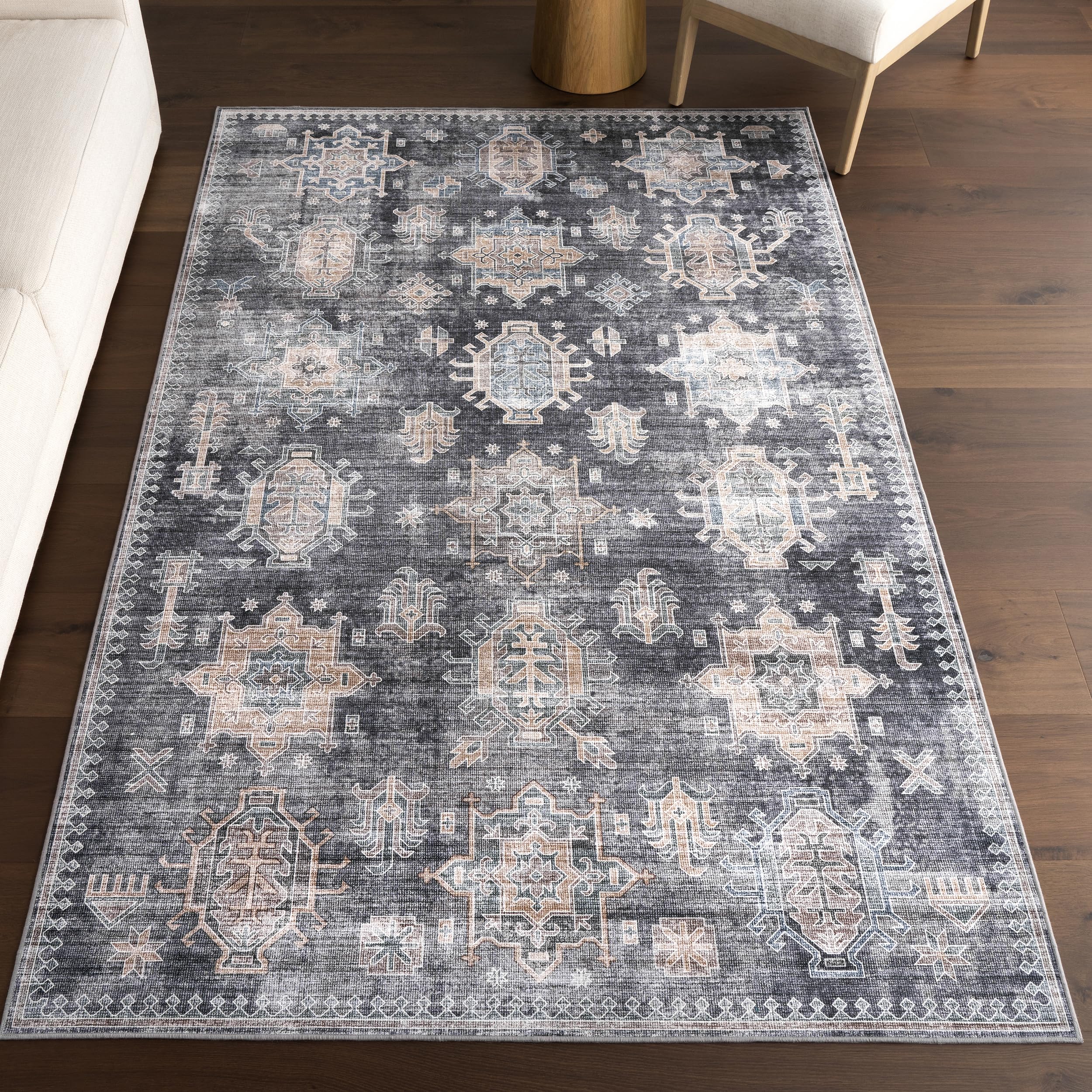 Nuloom Splashguard Philomena Charcoal/Beige, 5' x 8', Vintage, Soft and Cozy, High Traffic, Stain Resistant, Easy Clean, Durable, Machine Washable