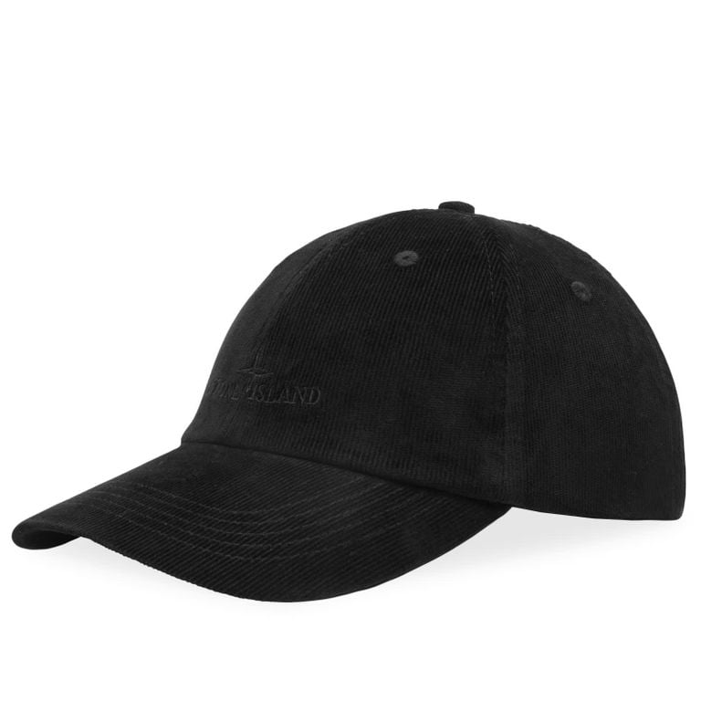 Men's Stone Island Corduroy Cap - Black - Hats Cut from micro-corduroy cotton, this cap from Stone Island is a real staple. Detailed with a tonal embroidered logo at the face, it’s finished with a curved brim and adjustable back tab for a secure fit...