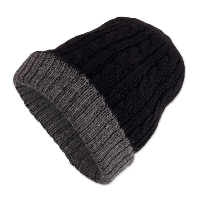 Warm and Cozy,'Peruvian 100% Alpaca Reversible Black and Grey Ribbed Hat'