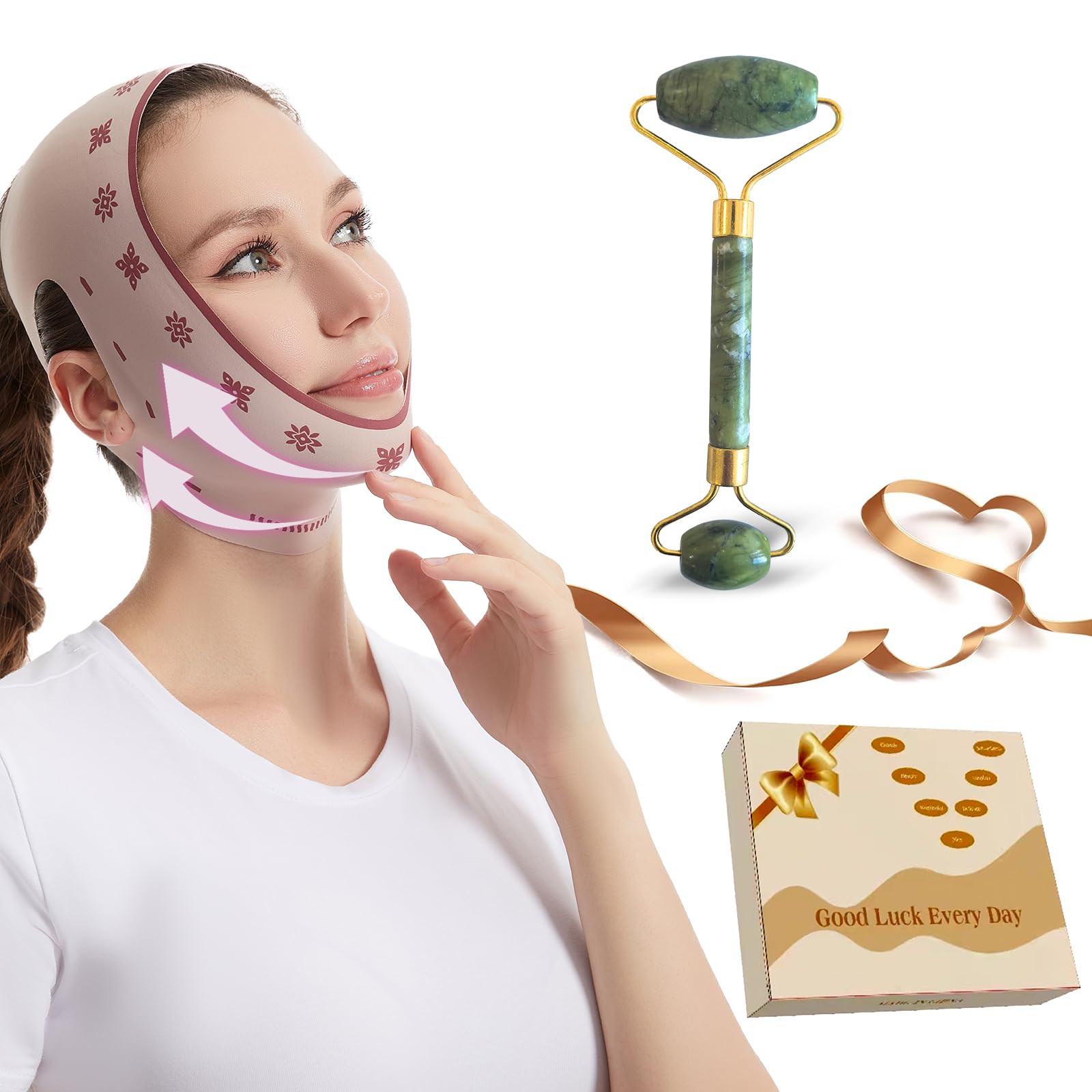 Reusable V Line Jawline Lifter | Double Chin Reducer Face Strap with Jade Roller | Breathable Sleep & Daily Use Face Mask for Sagging Skin & Contour