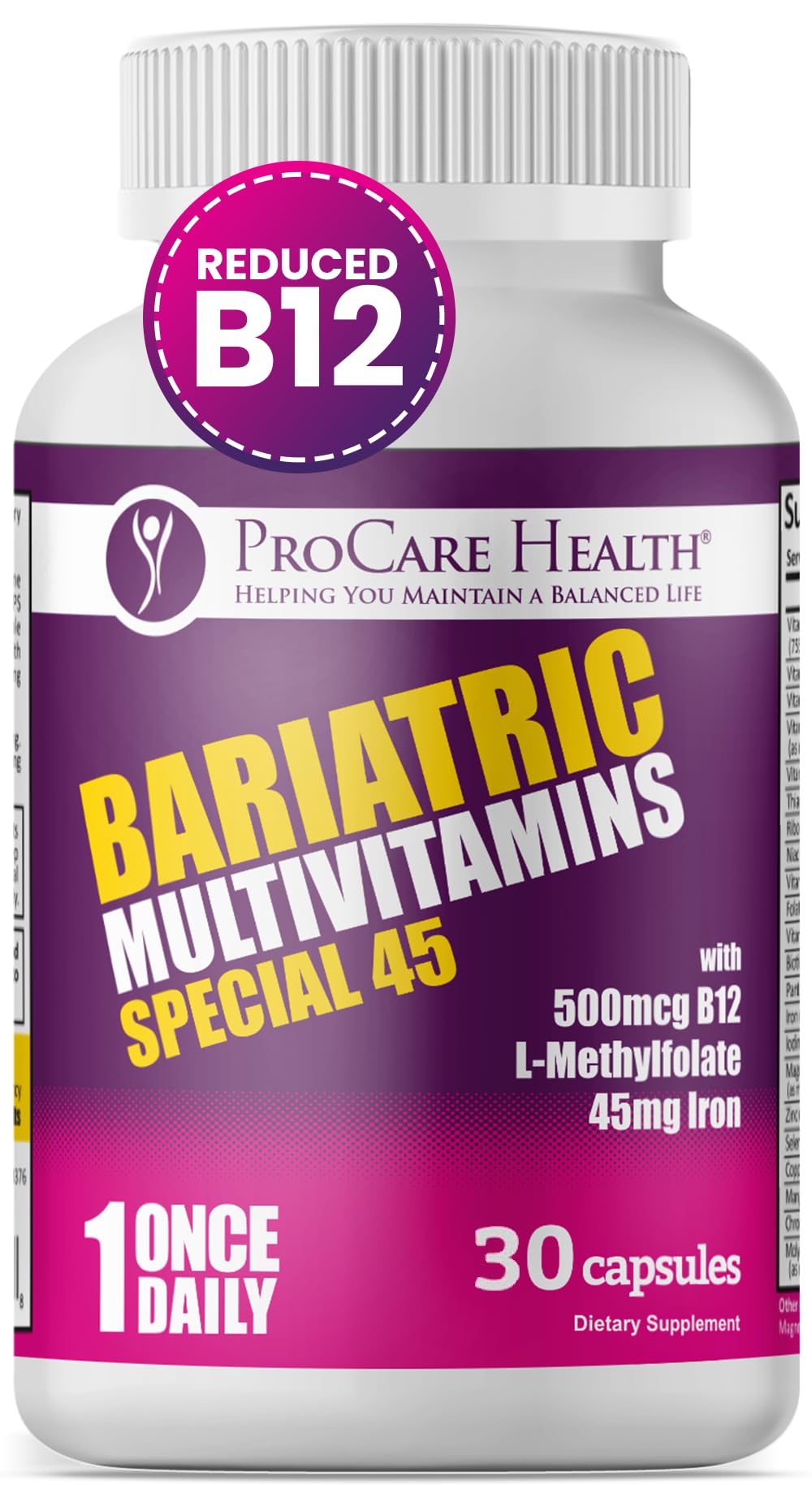 ProCare Health Bariatric Multivitamin with Iron (30 Capsule) 45mg Iron with Reduced B12 - Post-Op Bariatric Vitamins for Gastric Bypass Sleeve