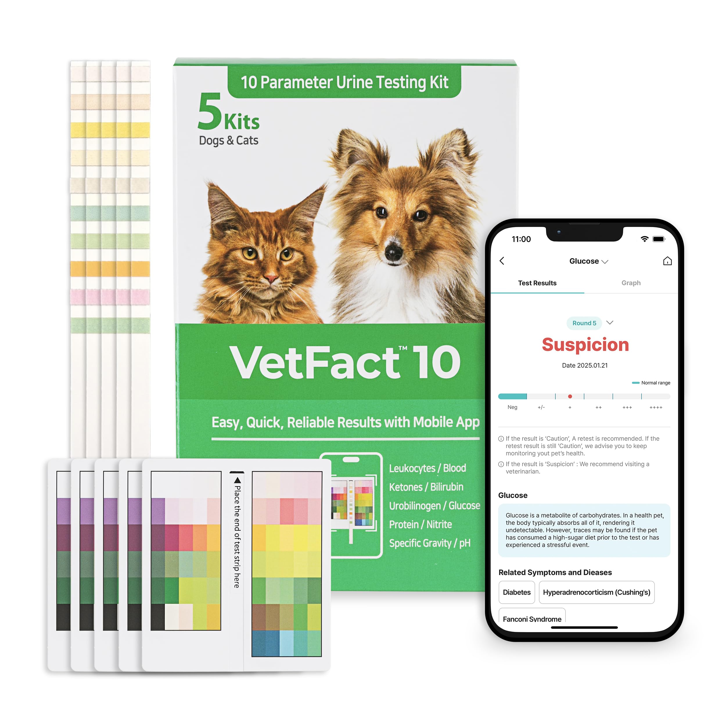 [5Kits] Free Mobile App 10 Parameter Urine Test Strips for Cat & Dog, Cat & Dog UTI Test Strips at Home ; Glucose, Specific Gravity, pH, Ketone,